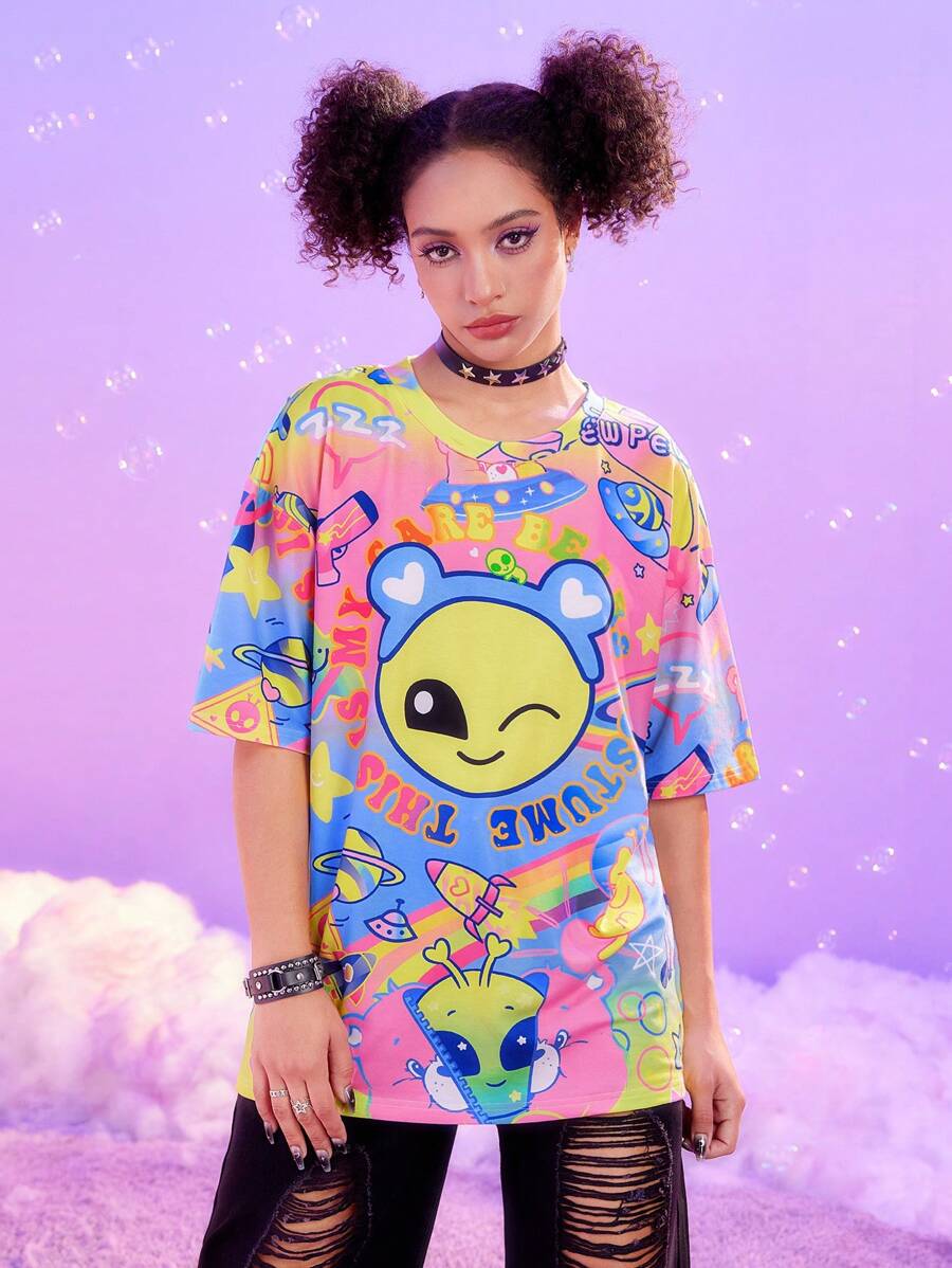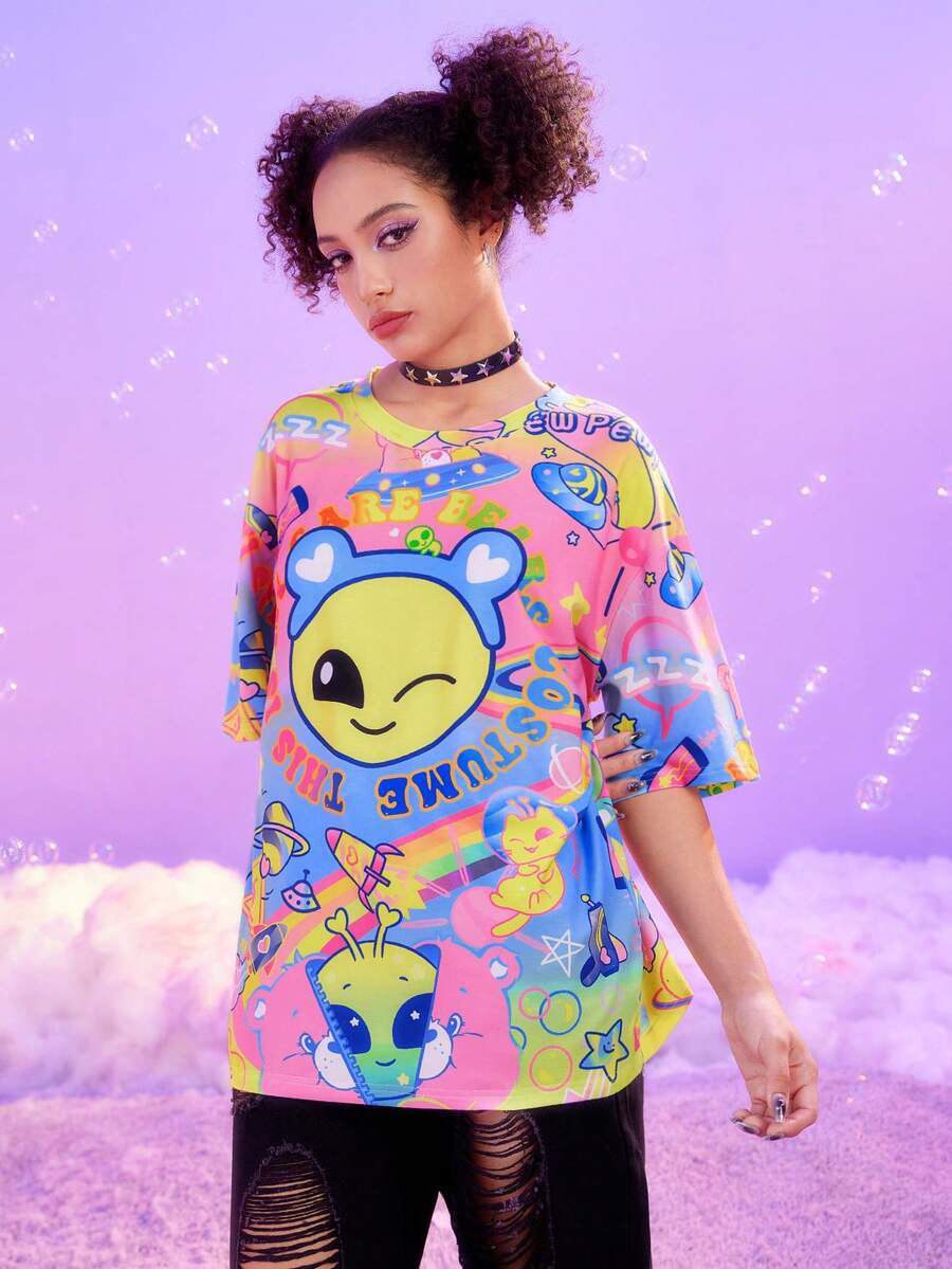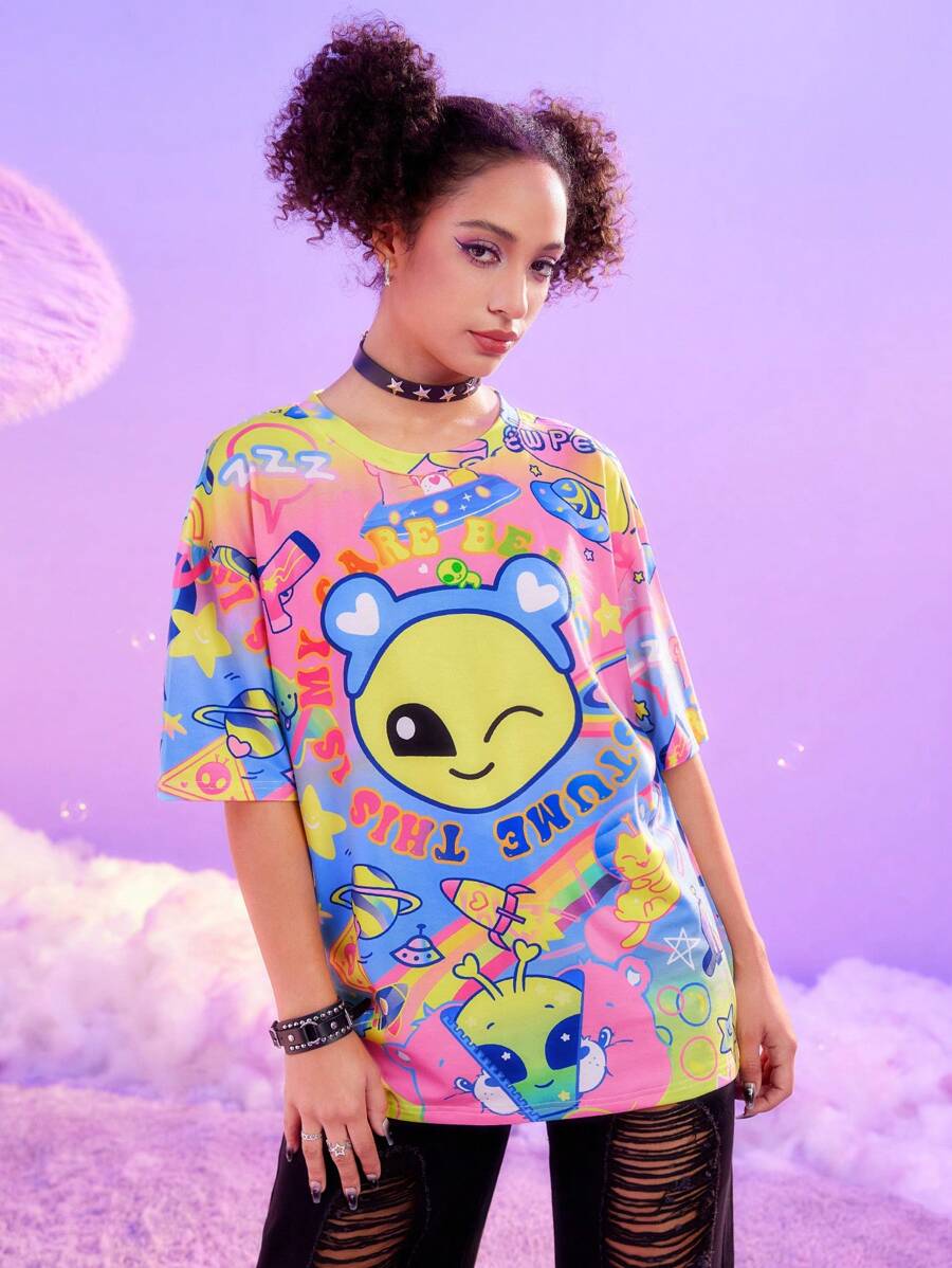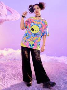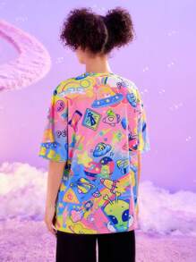 ROMWE X Care Bears Alien Letter Print Drop Shoulder Short Sleeve T-Shirt