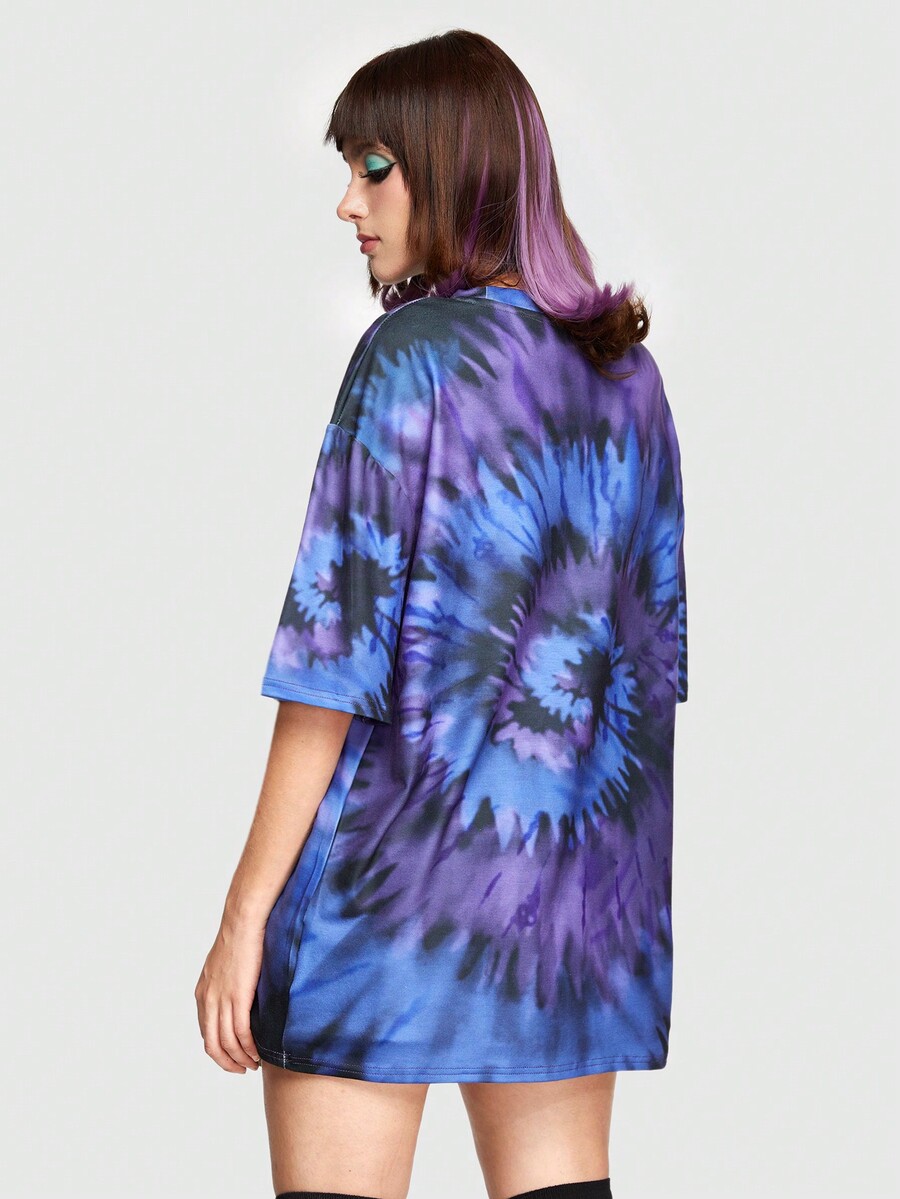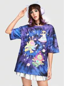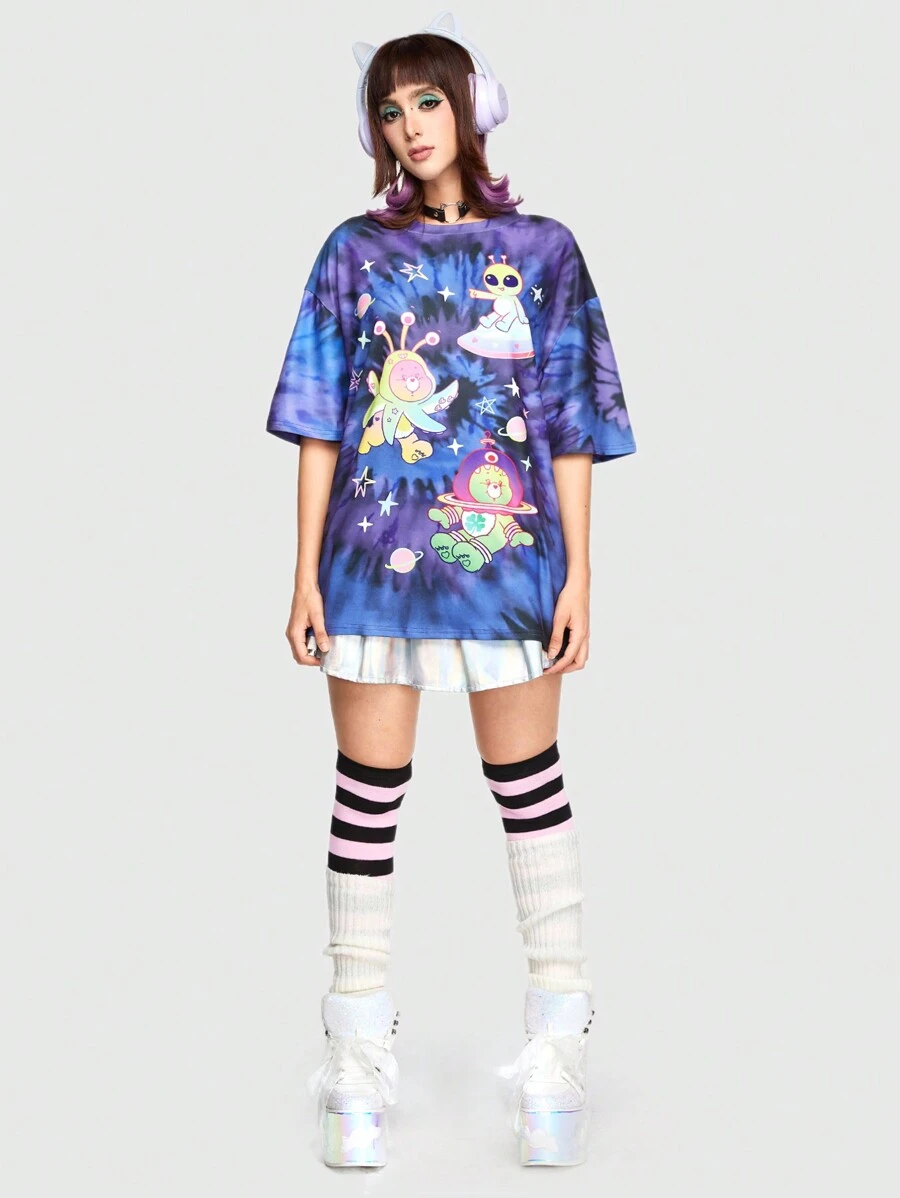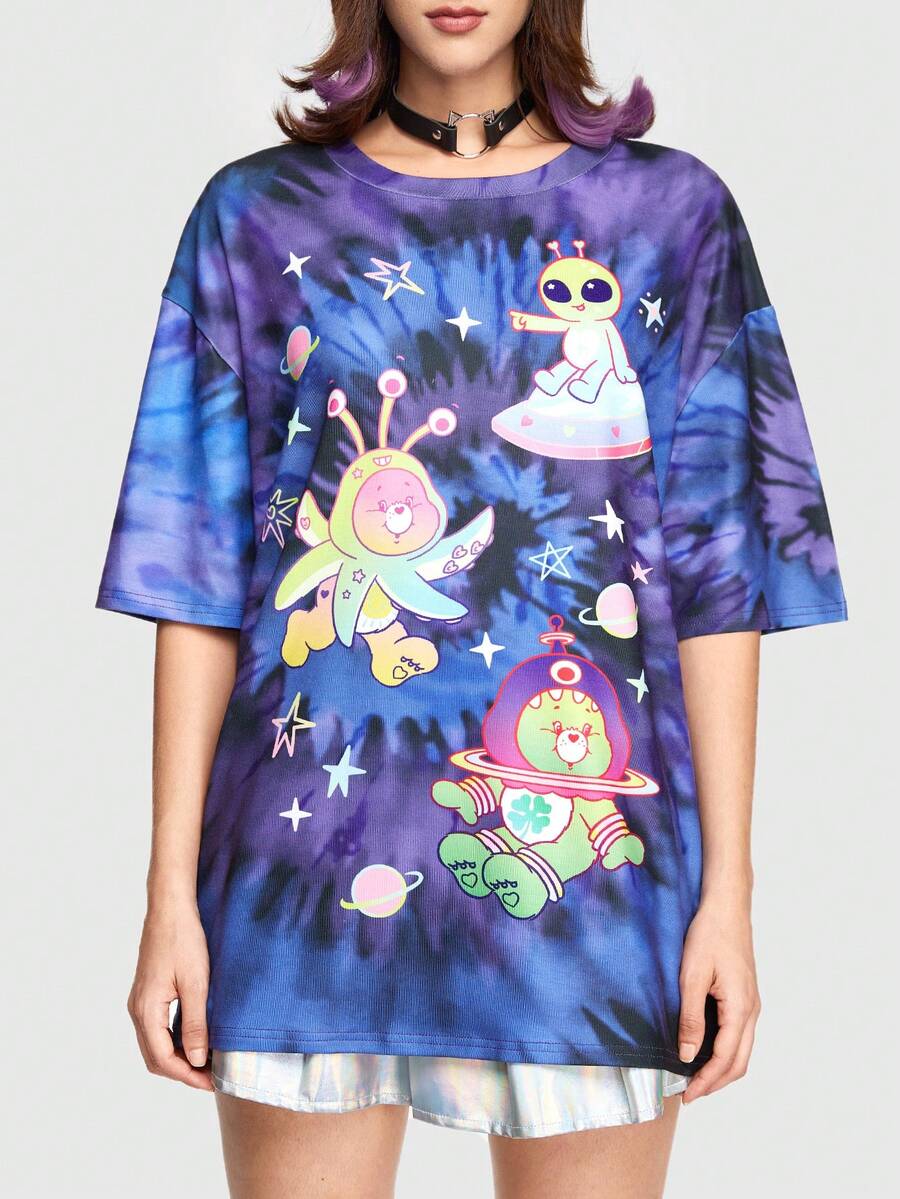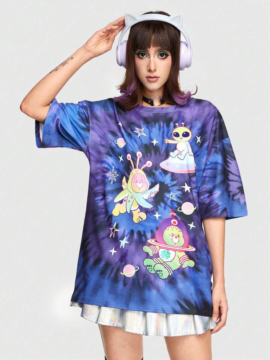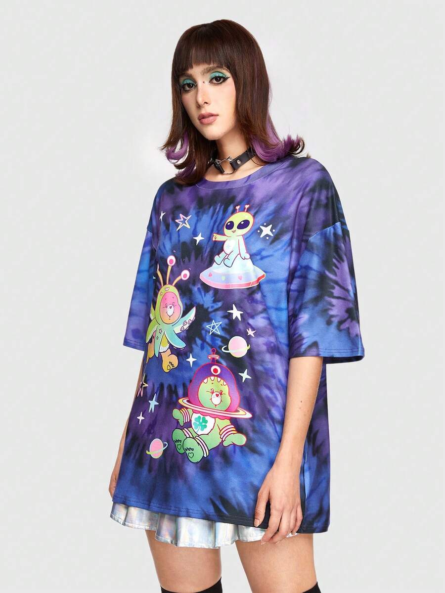 ROMWE X Care Bears Tie Dye Rainbow Loose Fit Alien & Colorful Star Printed T-Shirt