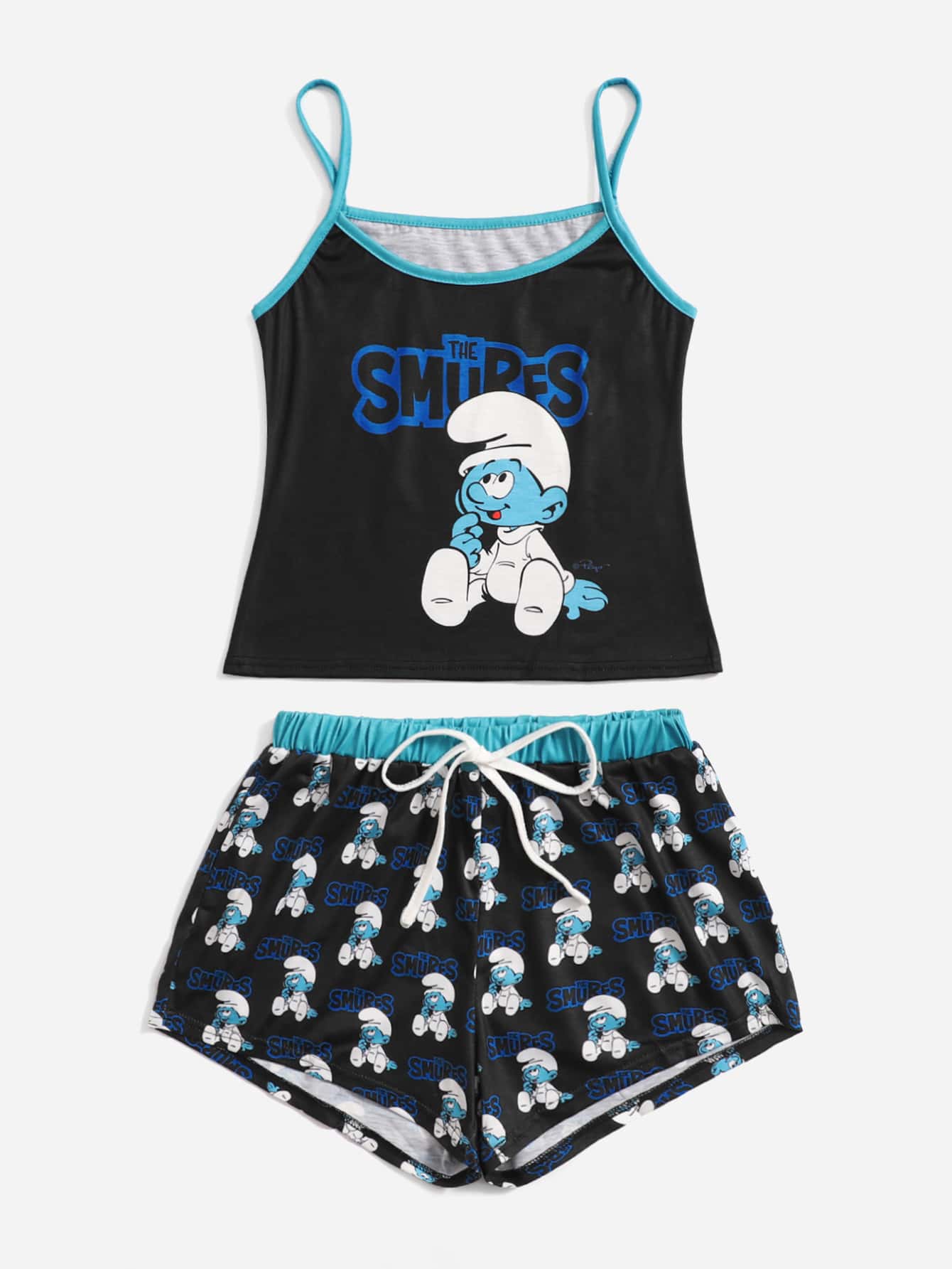 ROMWE X The Smurfs Cartoon Graphic Contrast Binding PJ Set, School