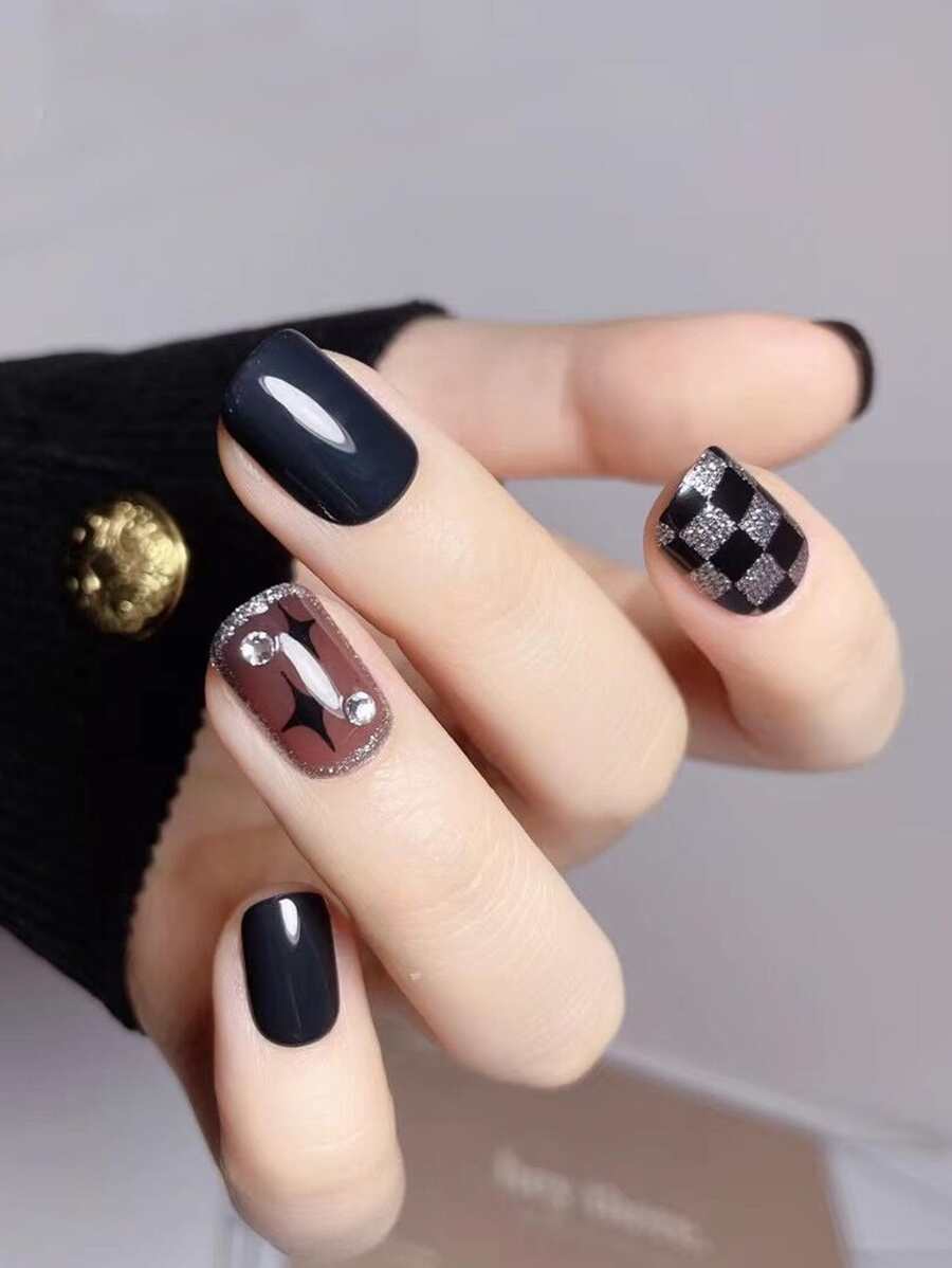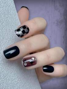 Goth 10pcs Short Square Rhinestone Decor Fake Nail