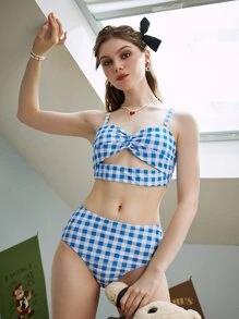Retro Gingham Twist Cut Out Summer Beach Bikini Set
