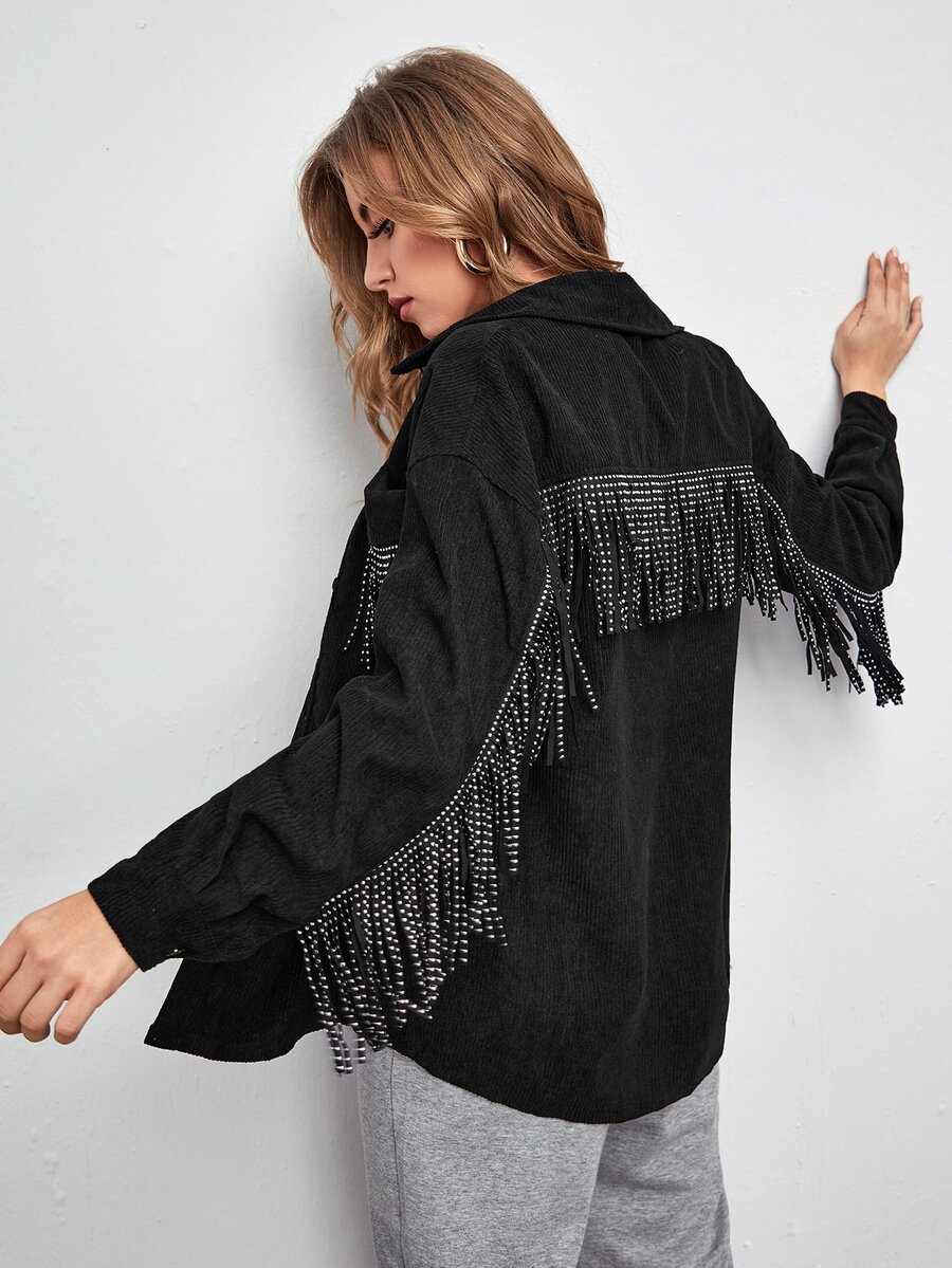 Rhinestone Fringe Trim Curved Hem Cord Coat