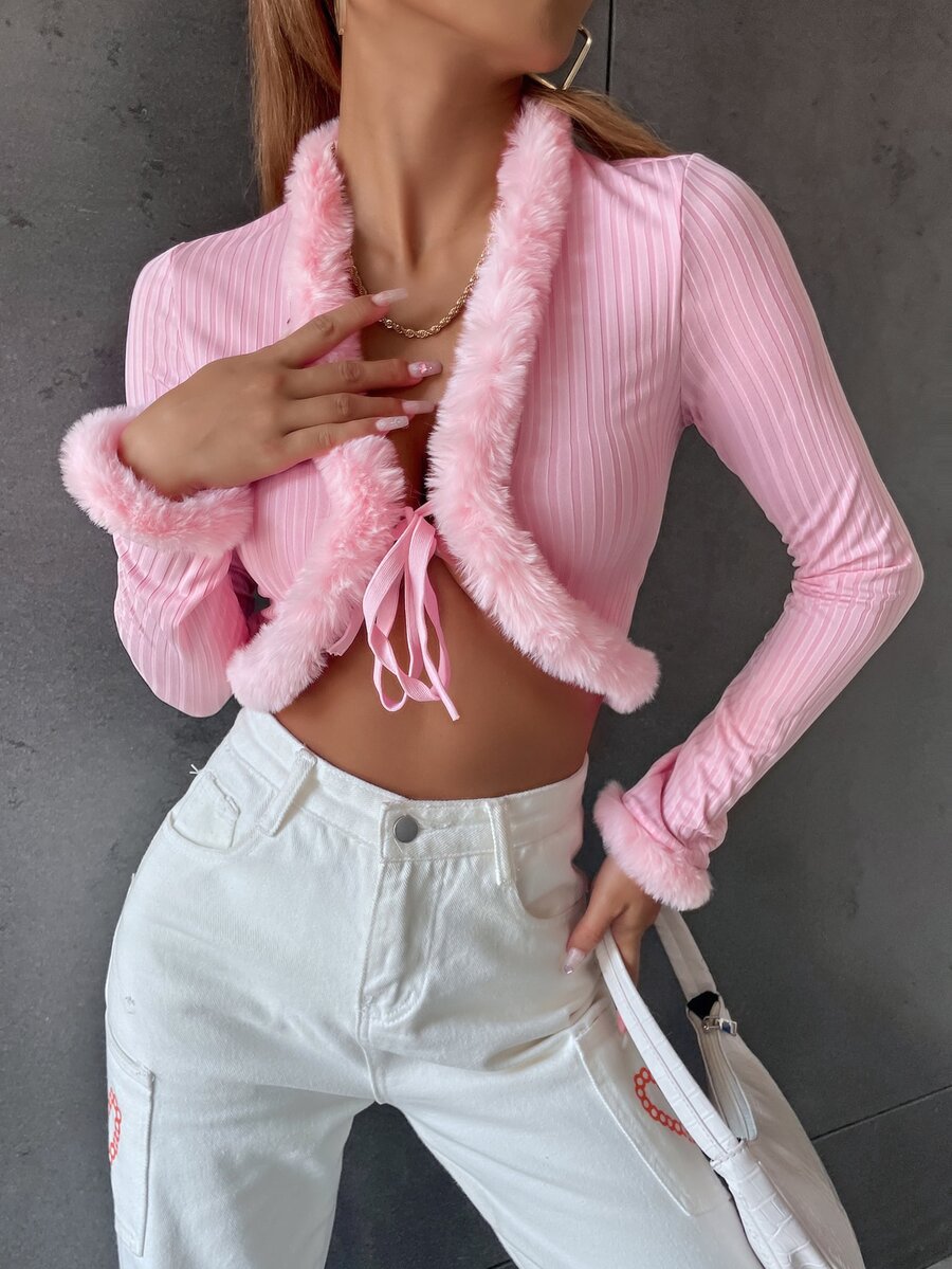 Ribbed Knit Fuzzy Trim Knot Front Crop Jacket