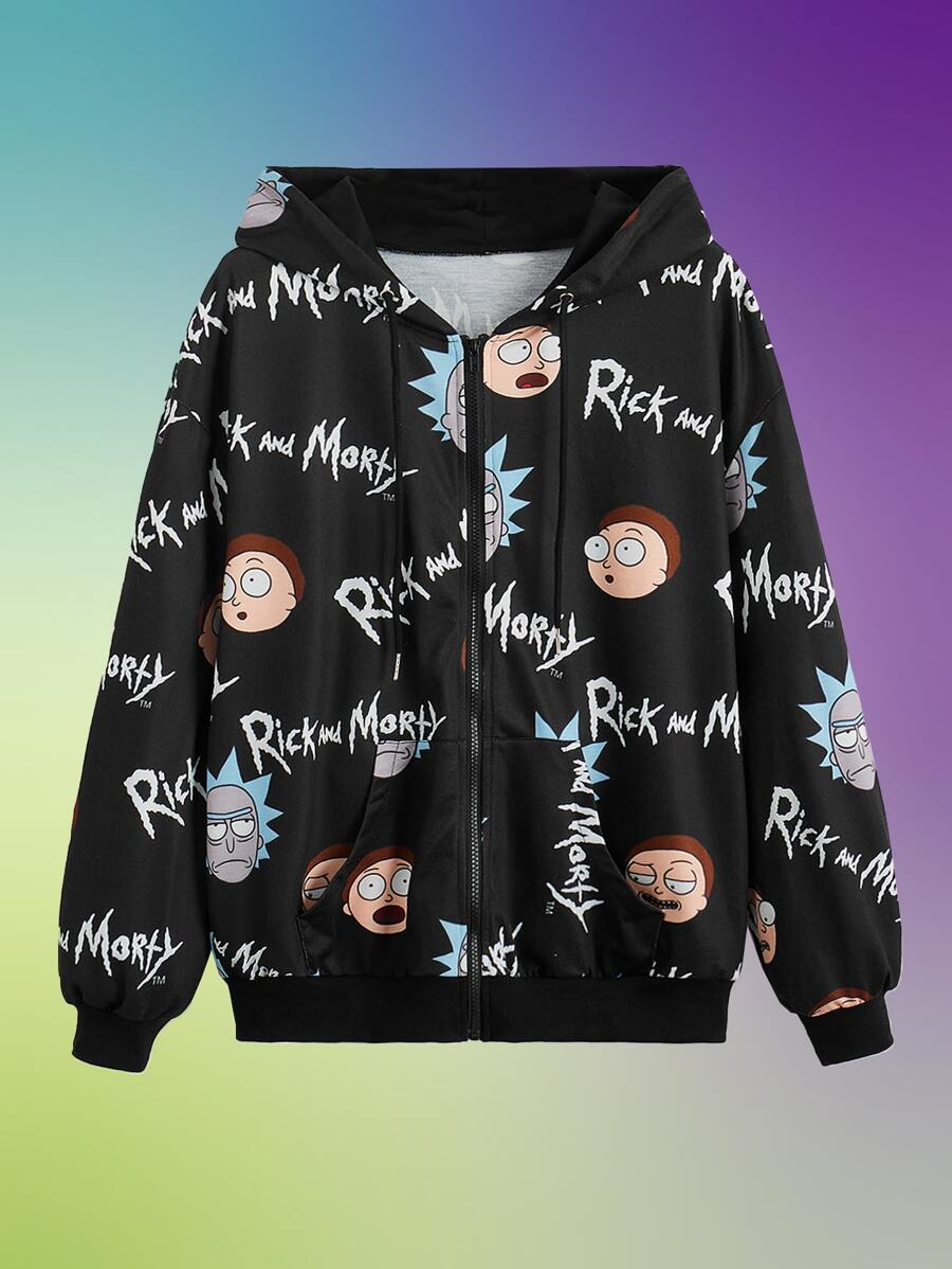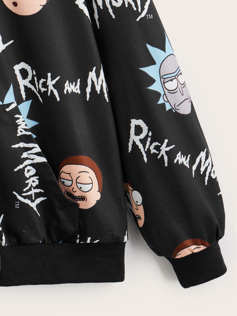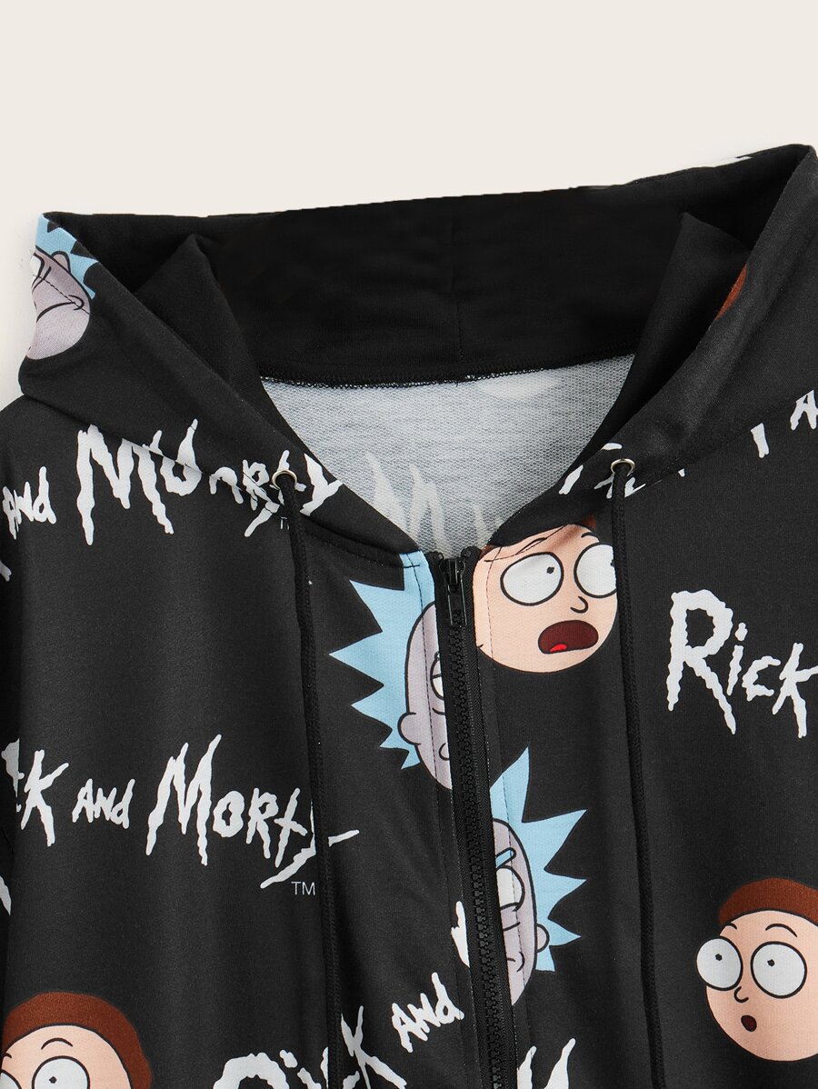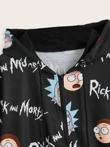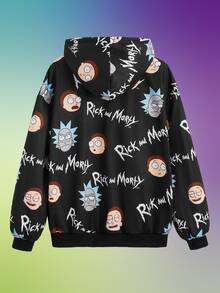 Rick and Morty | ROMWE Letter & Figure Graphic Zip Up Drawstring Hoodie
