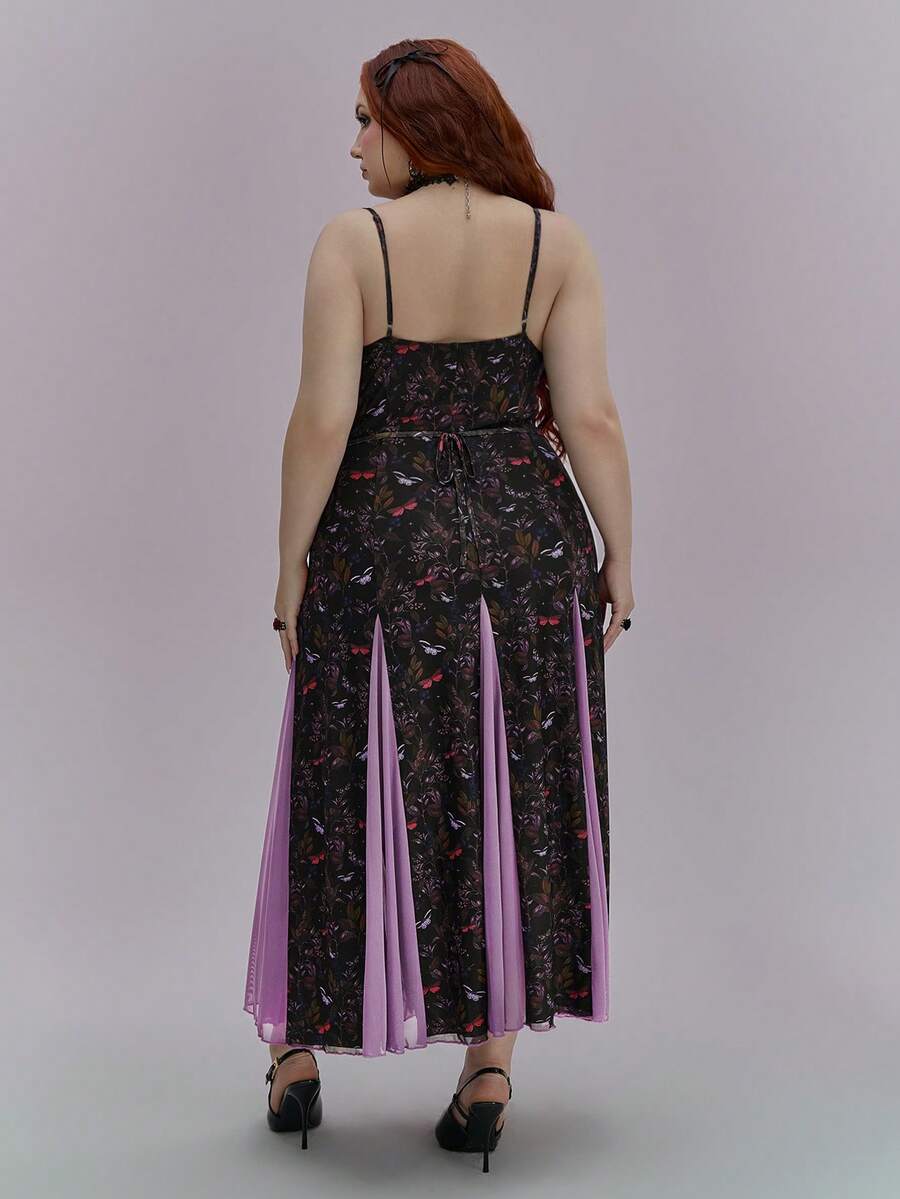 ROMWE Avant Romantic Summer Vacation Floral Print Mesh Slip Maxi Dress For Plus Size