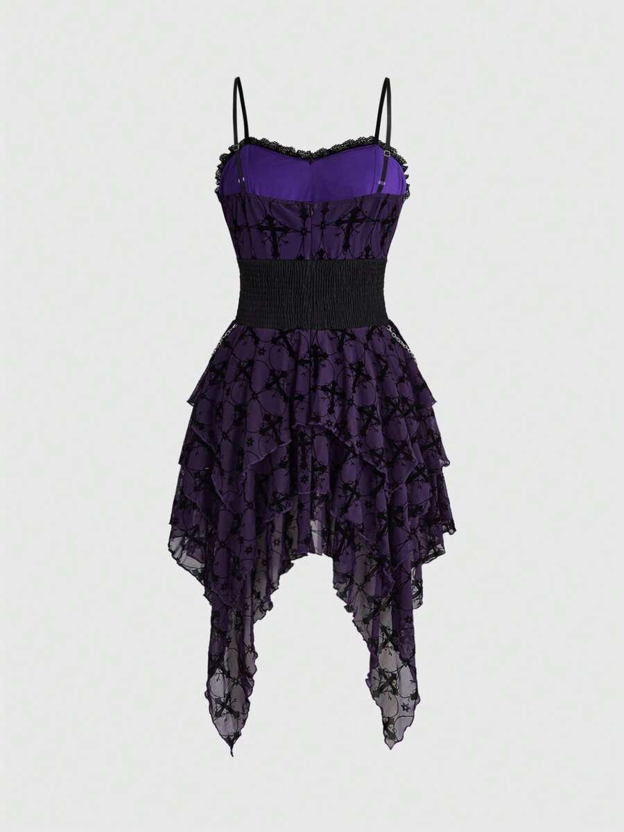 Romantic Vintage Gothic Cross Flocked Detachable Metal Chain Lace-Up Waist Asymmetrical Hem Women Dress
