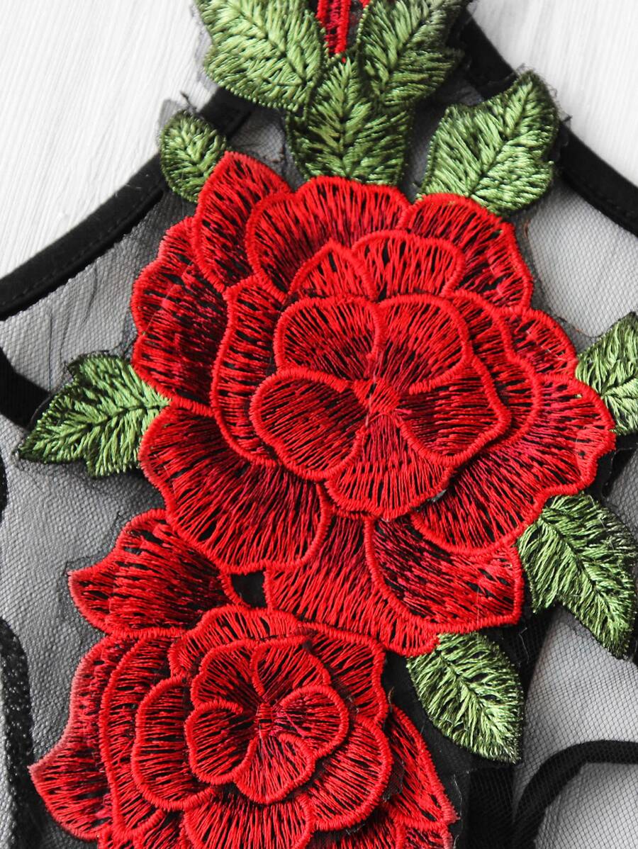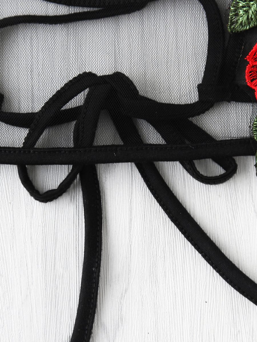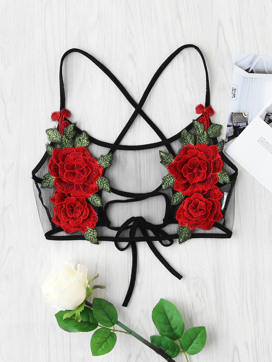 Rose Applique Lace Up Back Sheer Mesh Bralet