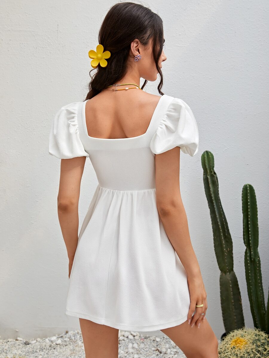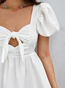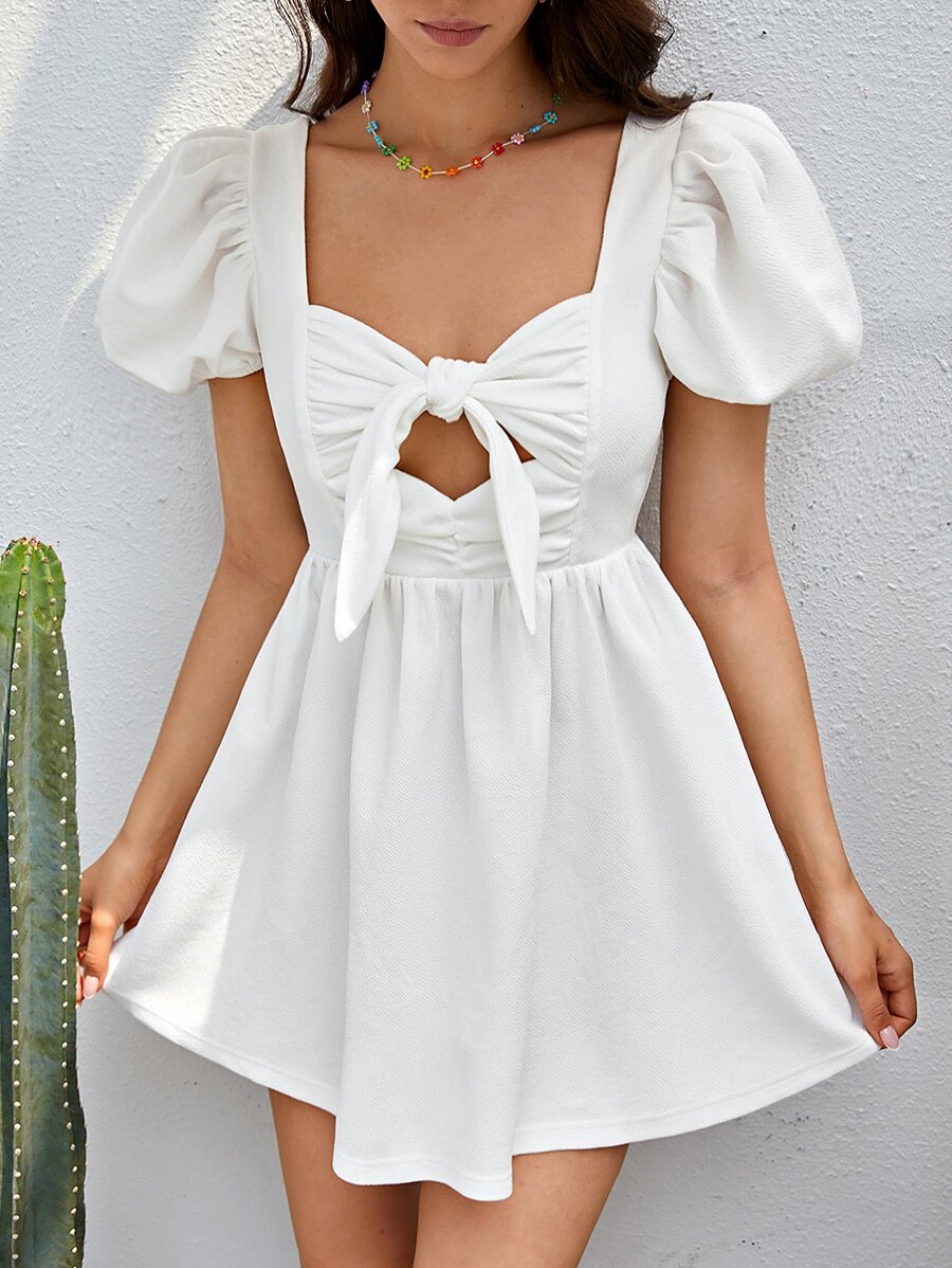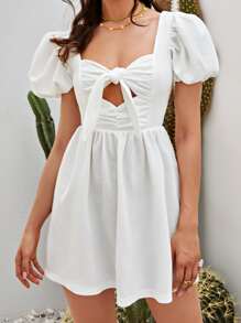 Ruched Cut Out Knot Front Puff Sleeve A-line Dress
