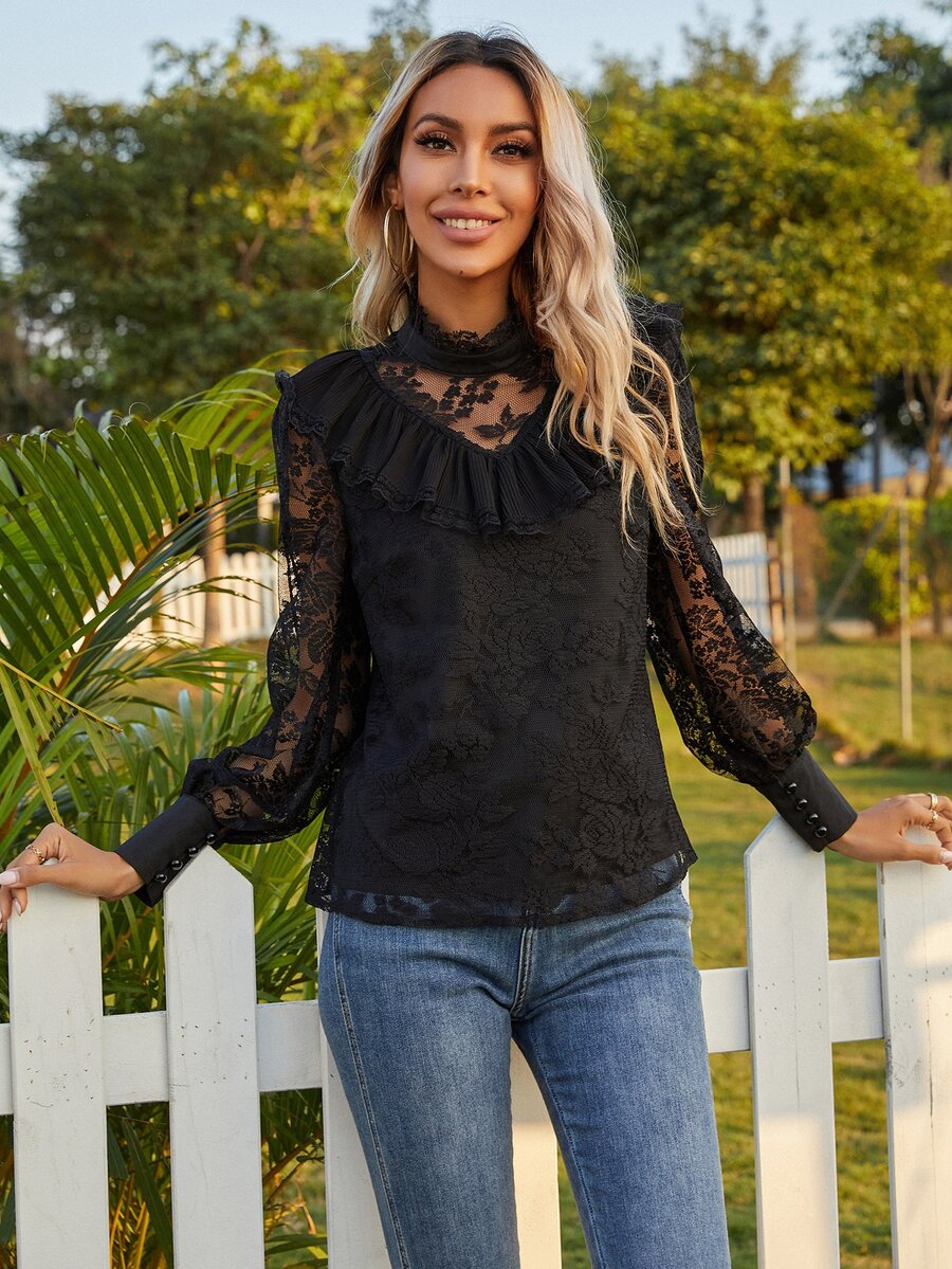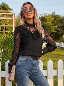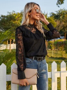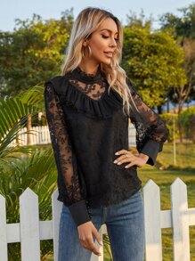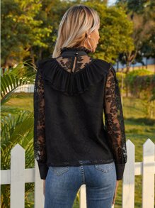 Ruffle Trim Mock Neck Lace Blouse