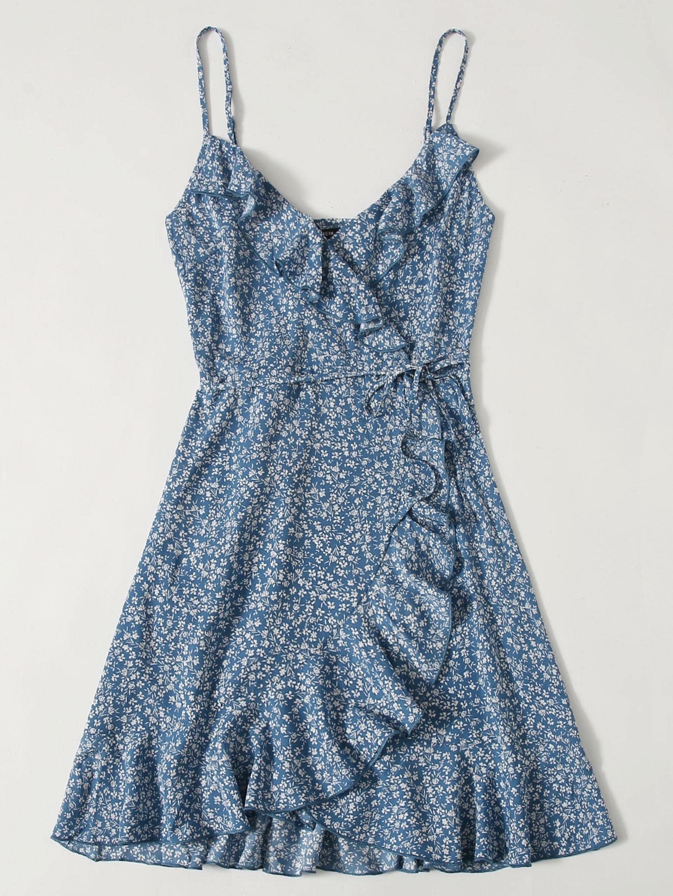 Ruffle Trim Wrap Tie Side Ditsy Floral Slip Dress