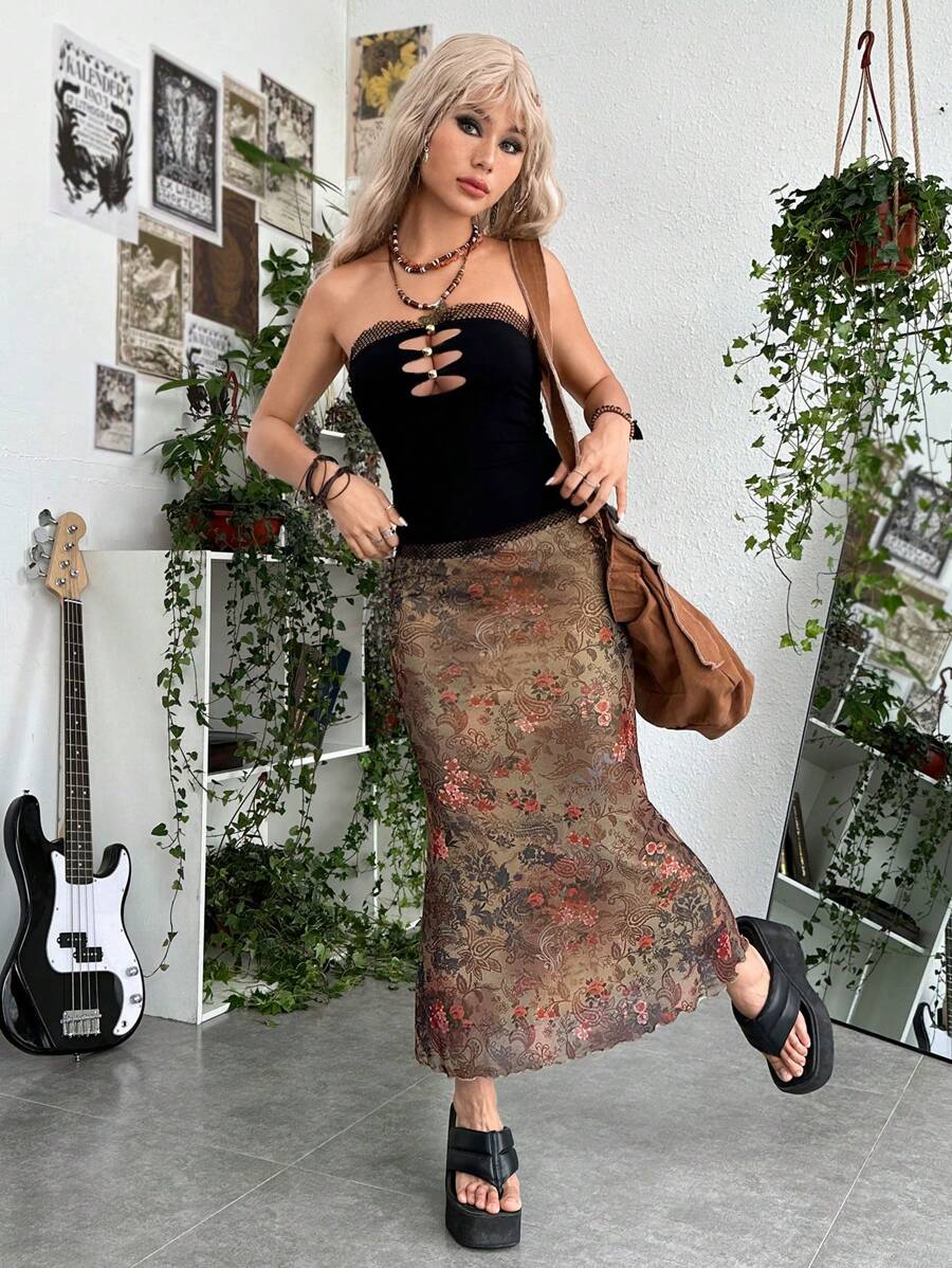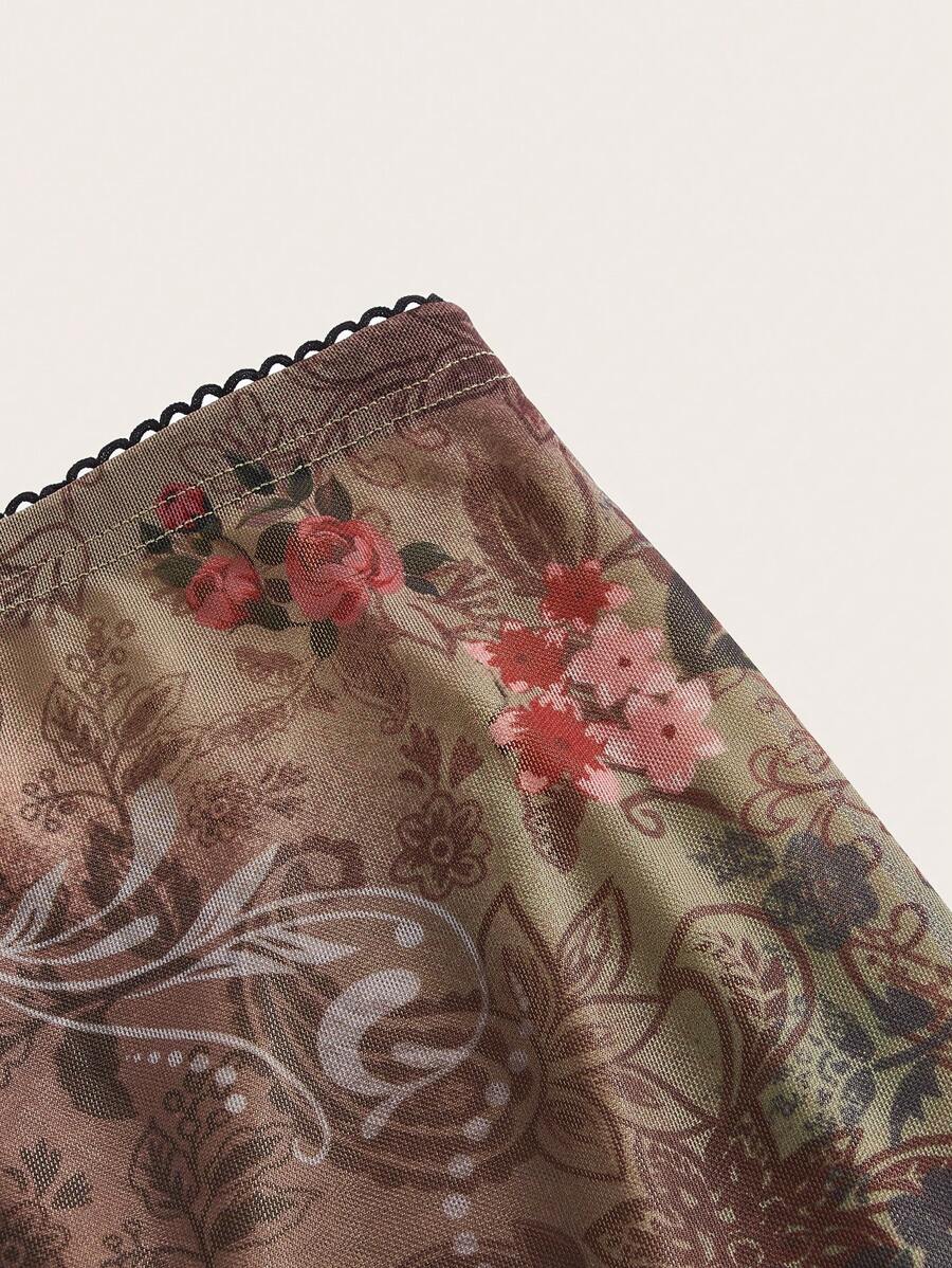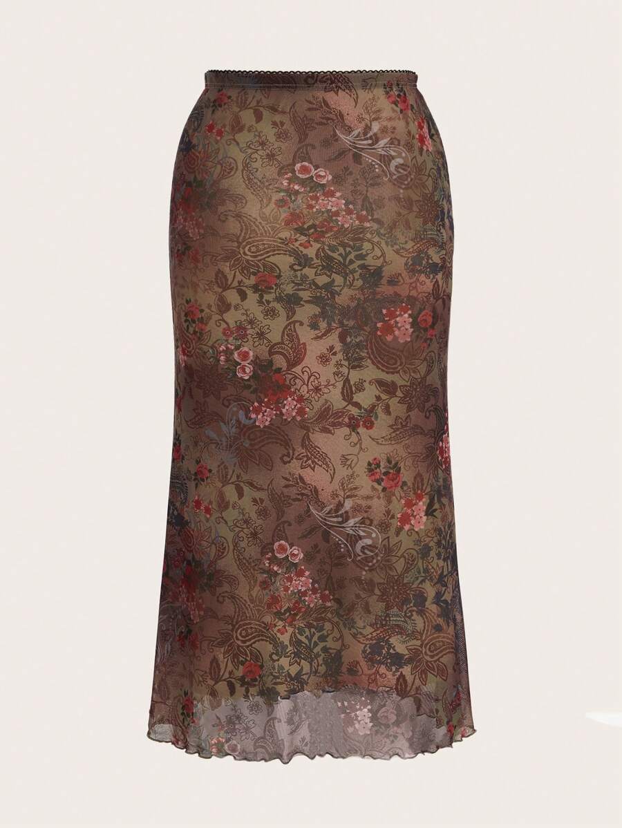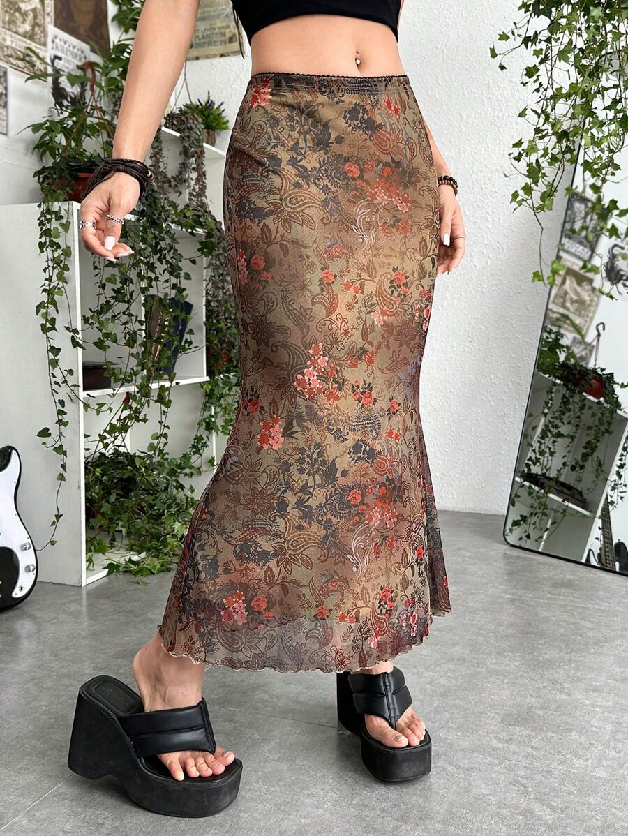 SHEIN x PRISCILA & JIMENA Grunge Floral & Paisley Print Lettuce Trim Mesh Overlay Mermaid Hem Skirt