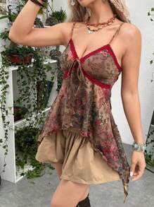 SHEIN x PRISCILA & JIMENA Grunge Floral Print Contrast Lace Cami Top