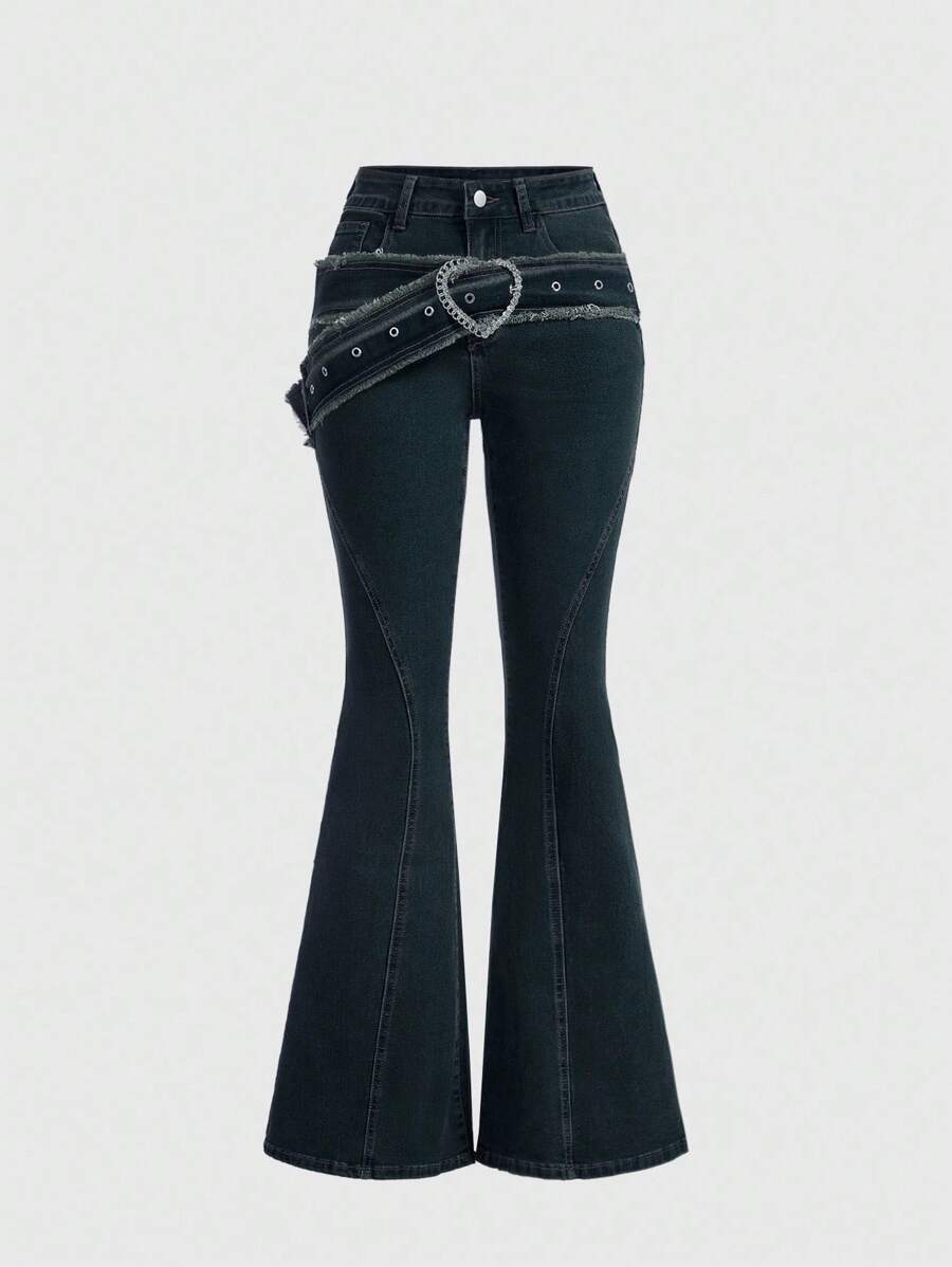 SHEIN x PRISCILA & JIMENA Grunge Punk Y2K Retro Heart Metal Buckle Fringe Waist Belt & Flared Jeans For Women, School,Ladies Casual Button Zipper Drop Waist Flare Leg Blue Bootcut Skinny Women Low Waist Jeans, Spring/Fall, Casual Daily Wear