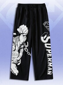 SUPERMAN X ROMWE Men's Casual Anime Heroes And Letters Printed Drawstring Waist Slant Pockets Black Straight Sweatpants