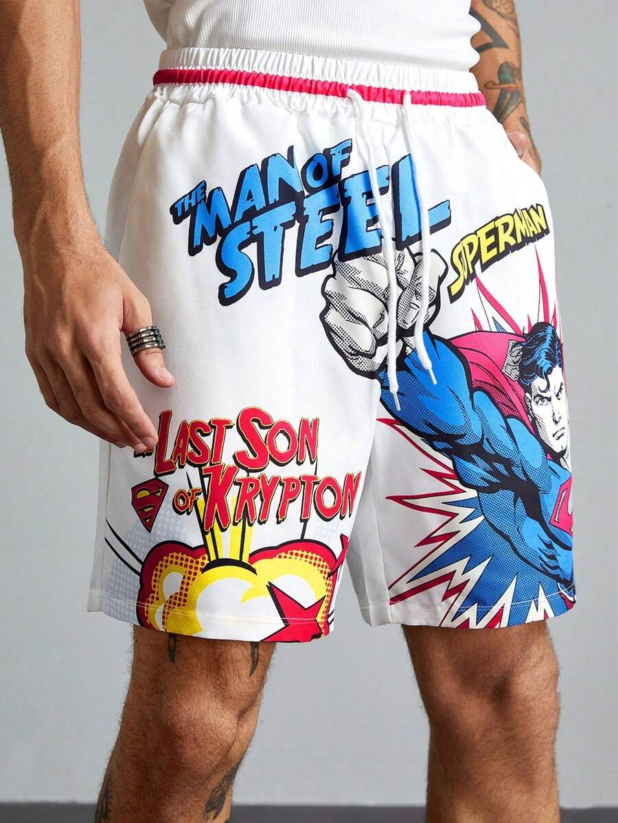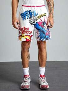 SUPERMAN X ROMWE Men's Drawstring Waist Slogan & Figure Print Casual Loose Shorts