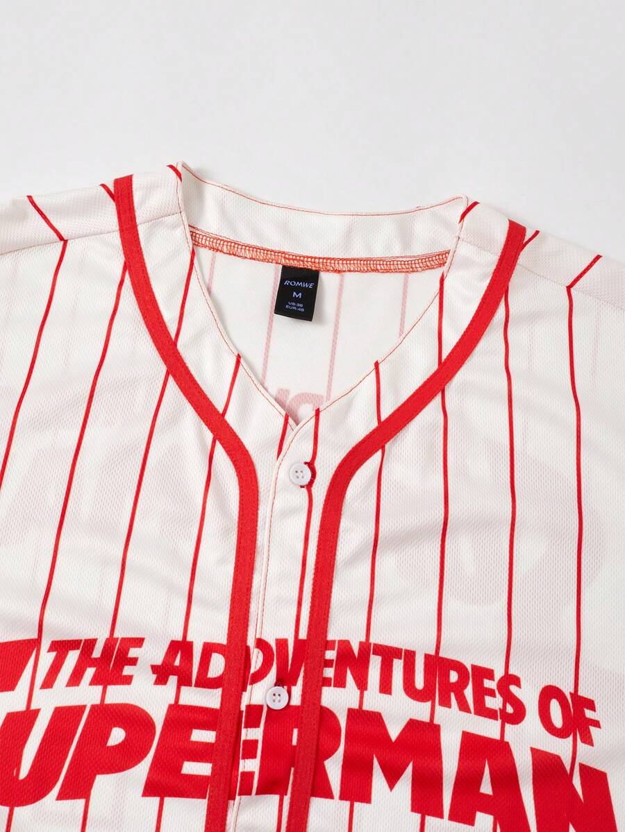 SUPERMAN X ROMWE Men's Slogan & Logo Print Striped V-Neck Loose Short Sleeve Shirt, Summer