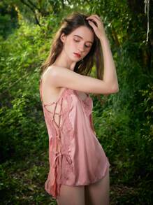 Satin Lace Up Contrast Lace Babydoll & Thong