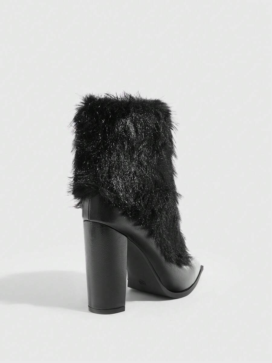 Sexy Fashion Fuzzy Ankle Boots, Pointed Toe, Chunky High Heels, Casual Versatile Side Zipper Black Boots For Women Valentine's Day