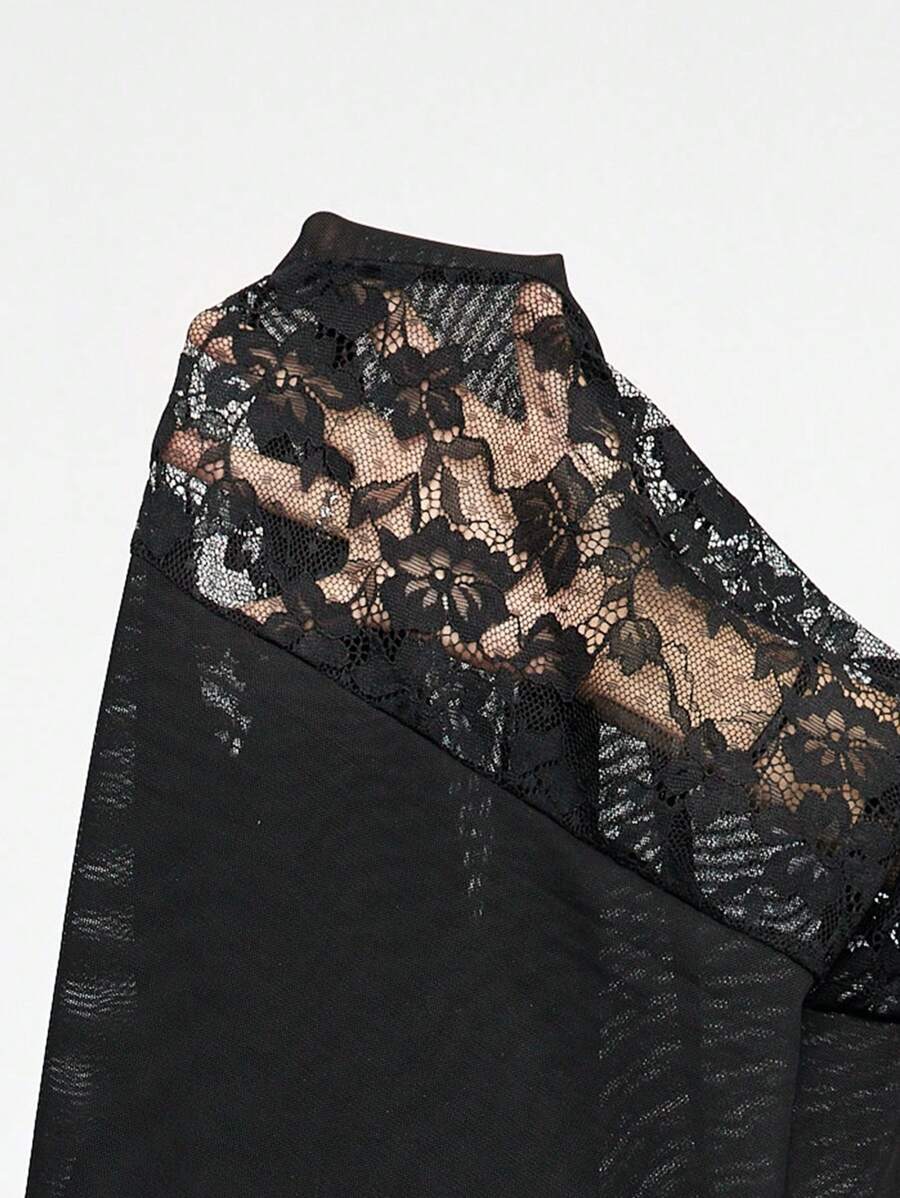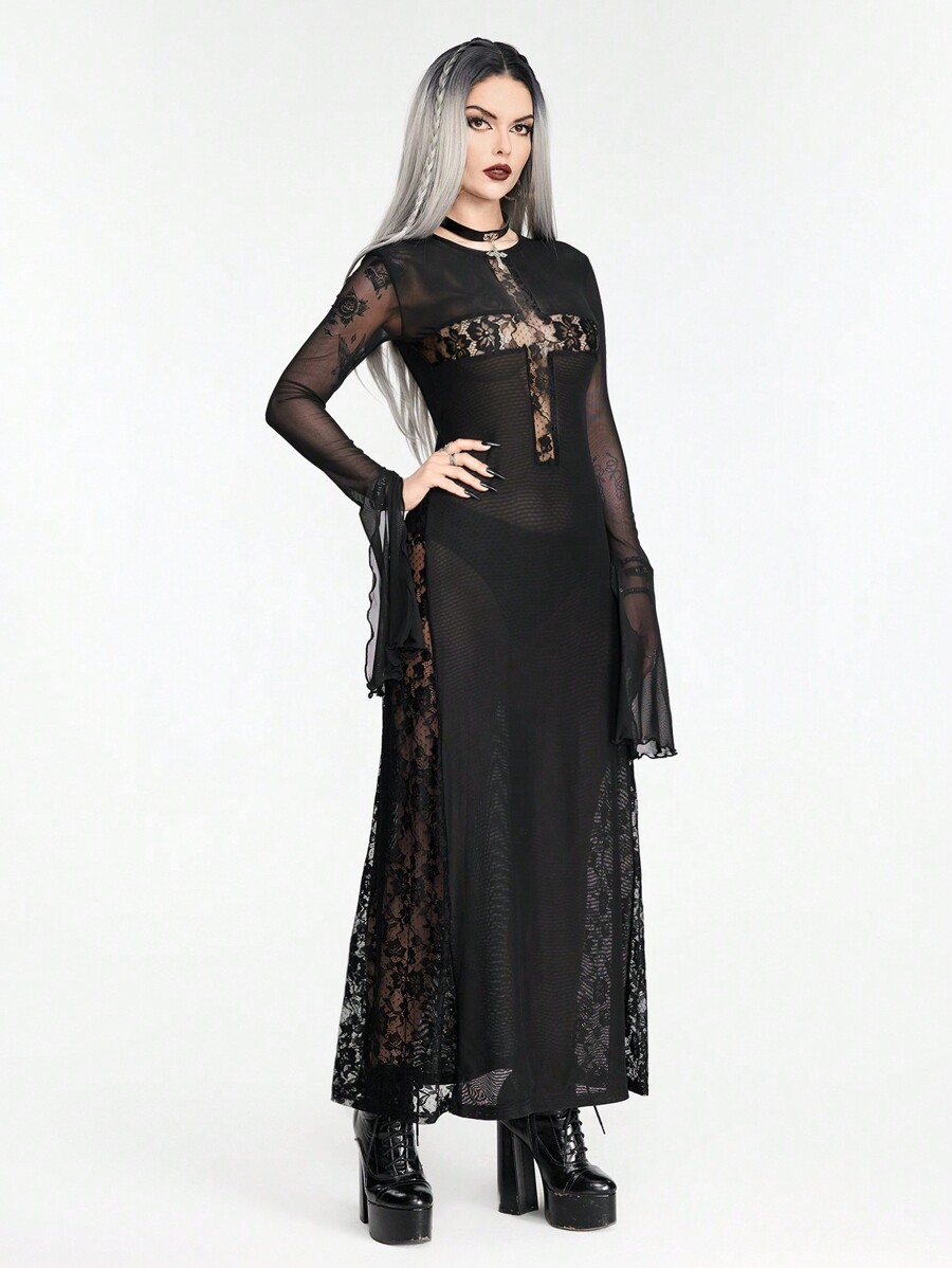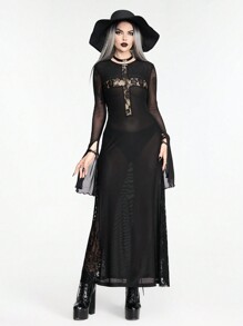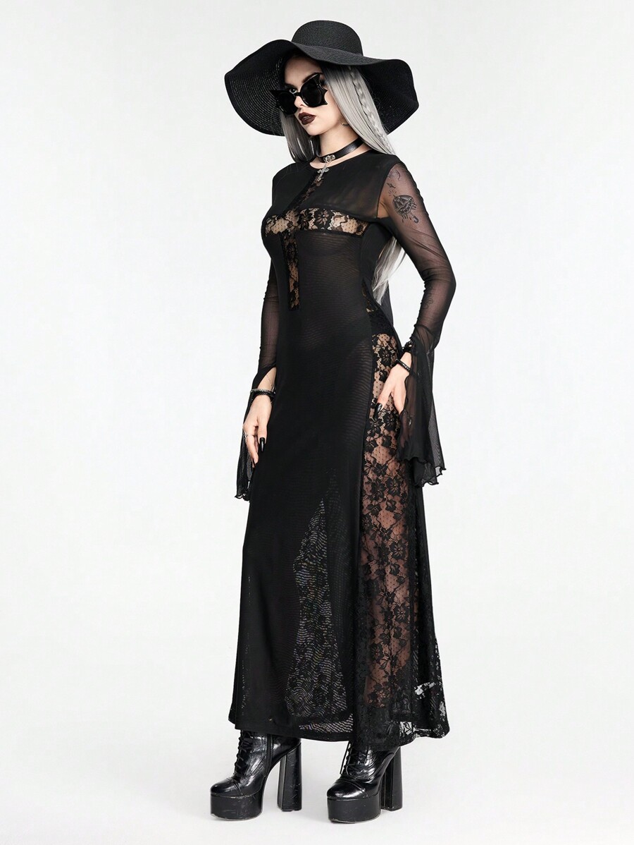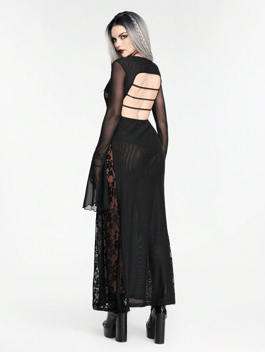 Sexy Gothic Style Black Summer Dress For Women With Cross Shaped Hollow Out Lace Design, Open Back, Perspective Trumpet Sleeves And Slim Fit Straight Cut
