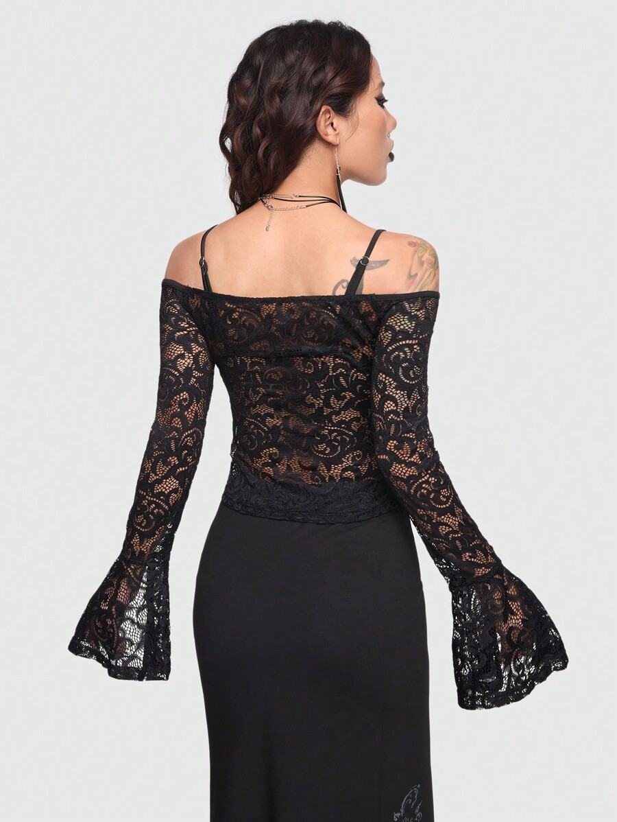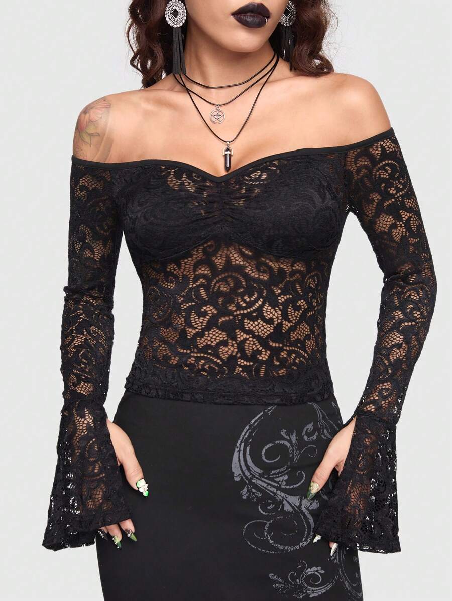 Sexy Gothic Style Perspective Waist-Cinching Off Shoulder Flare Sleeve Lace Crop Top For Women