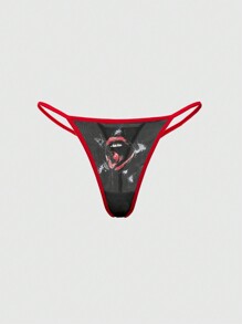 Sexy Lips & Cherry Print Contrast Mesh Trimmed Thong Panties