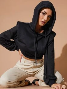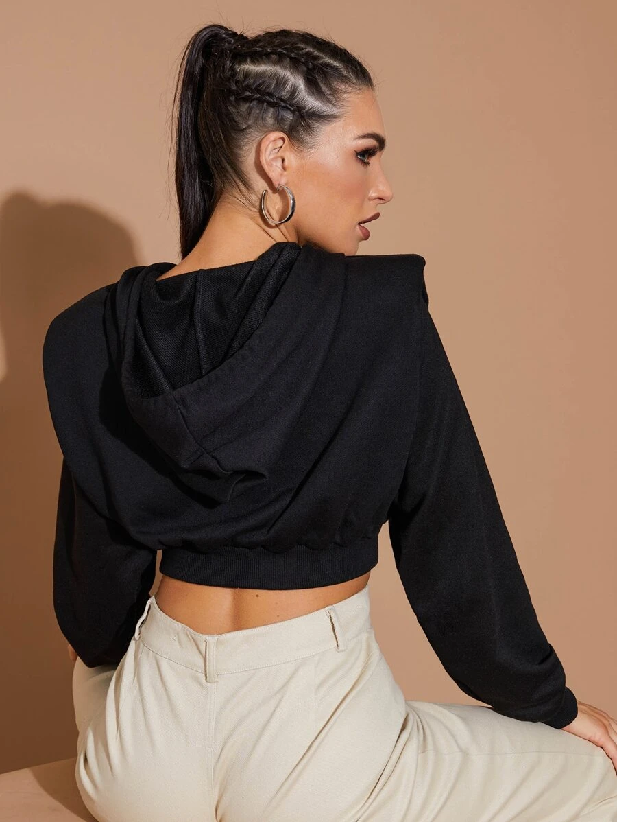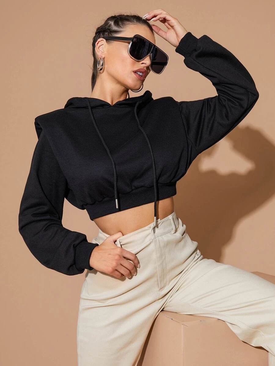 Shoulder Pad Crop Drawstring Hoodie