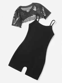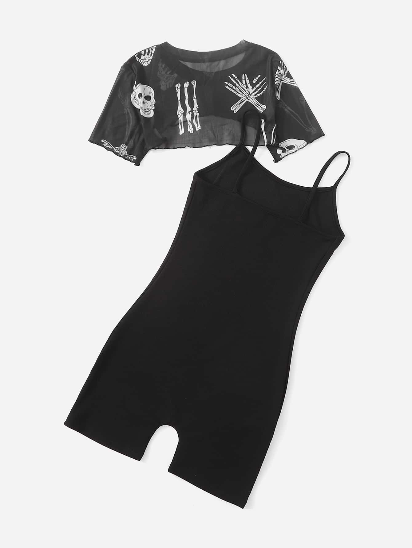 Skeleton Graphic Mesh Super Crop Top & Unitard Jumpsuit