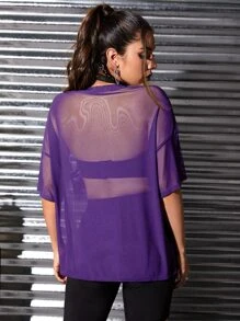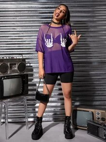 Skeleton Hand Print Drop Shoulder Mesh Top Without Bra