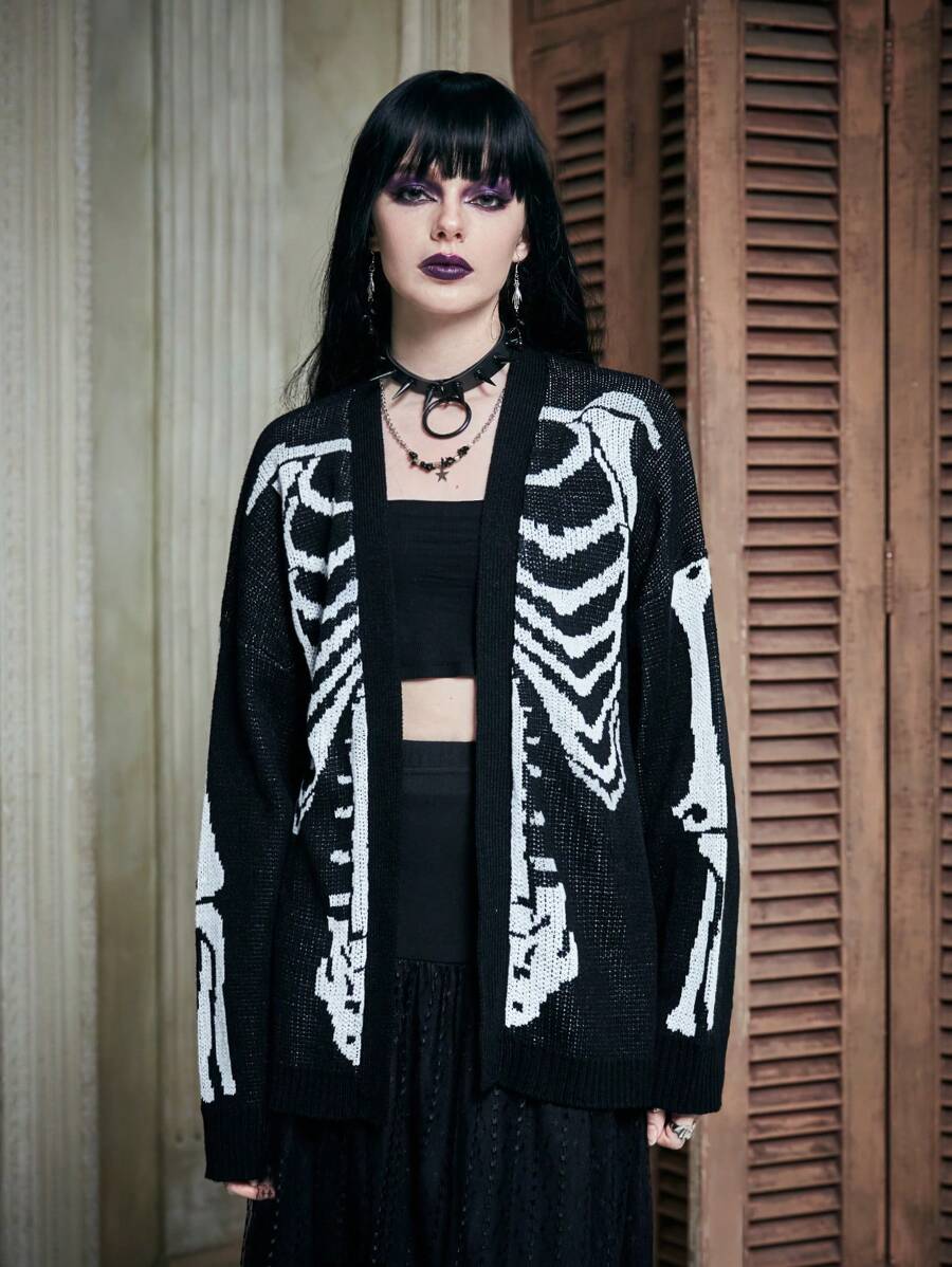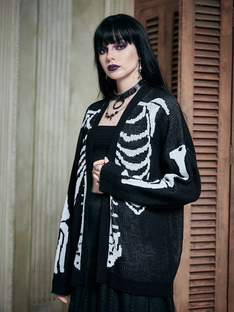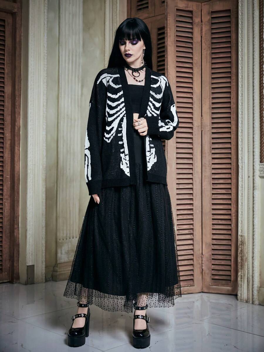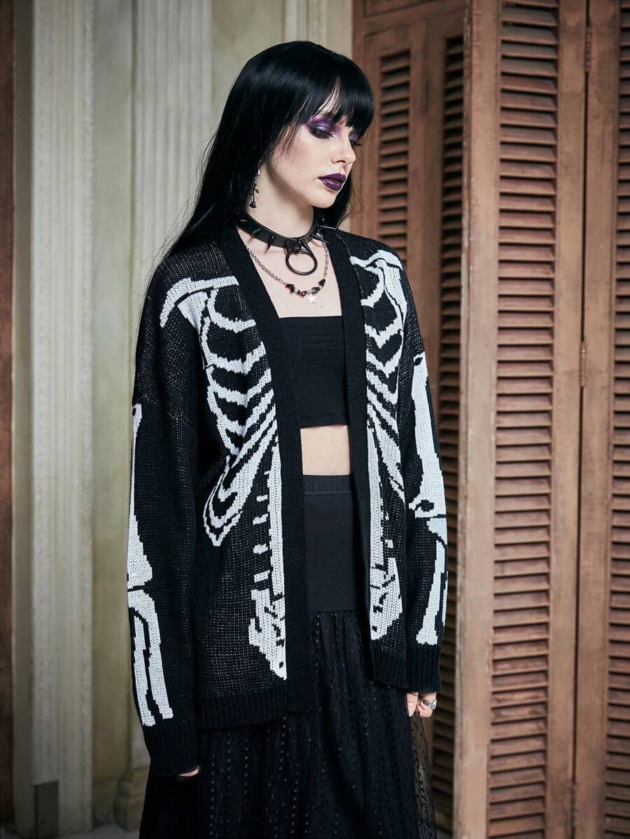 Skeleton Pattern Drop Shoulder Cardigan Without Cami Top, School