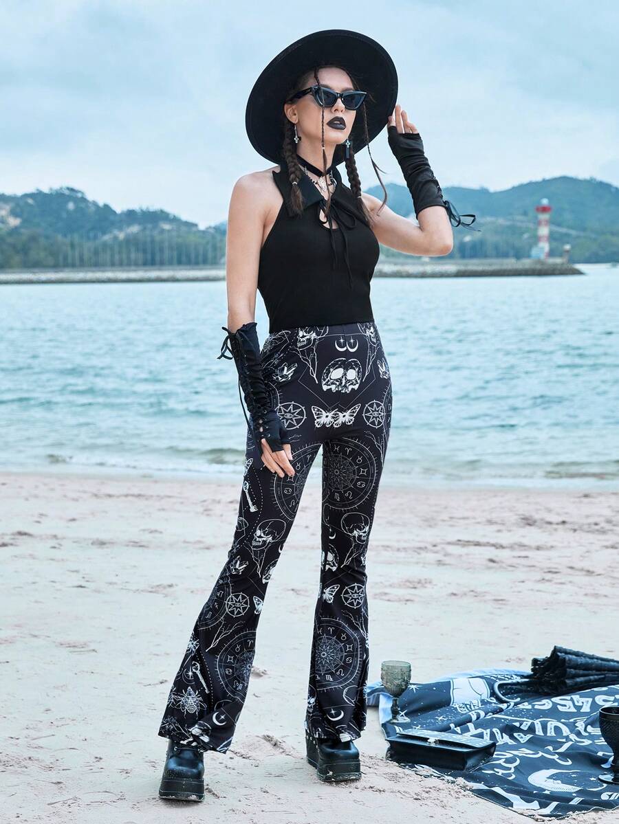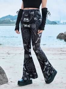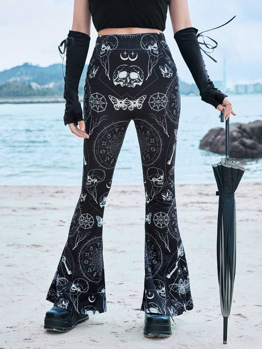 Skull & Butterfly Print Flare Leg Pants
