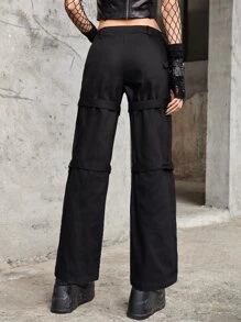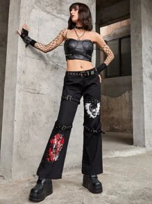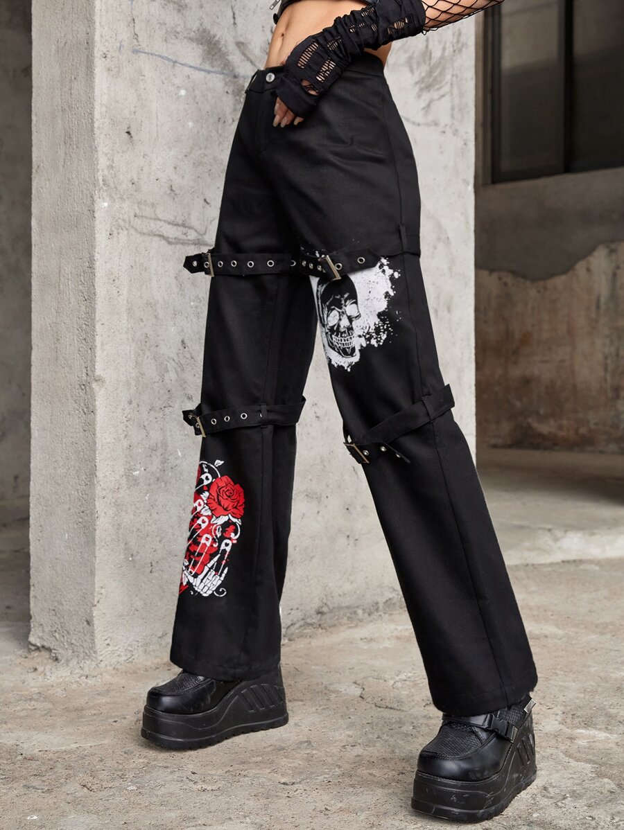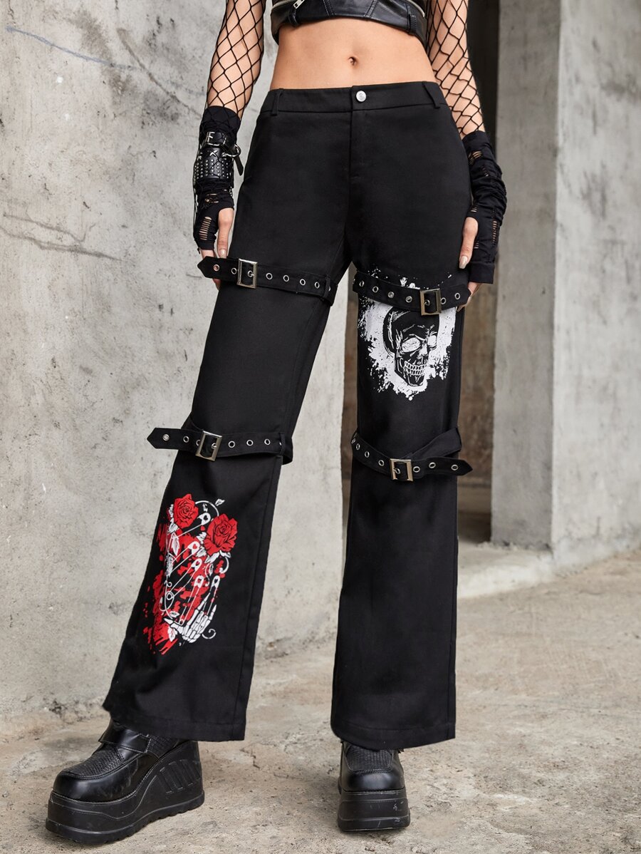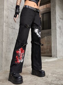 Skull and Floral Print Grommet Eyelet Buckle Detail Straight Leg Pants Without Belt
