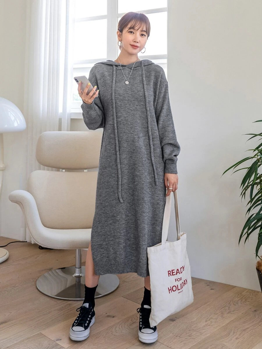 Slit Hem Drop Shoulder Drawstring Hooded Marled Knit Sweater Dress