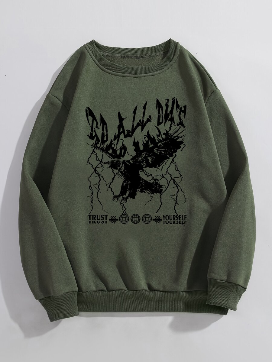 Slogan & Eagle Print Thermal Pullover
