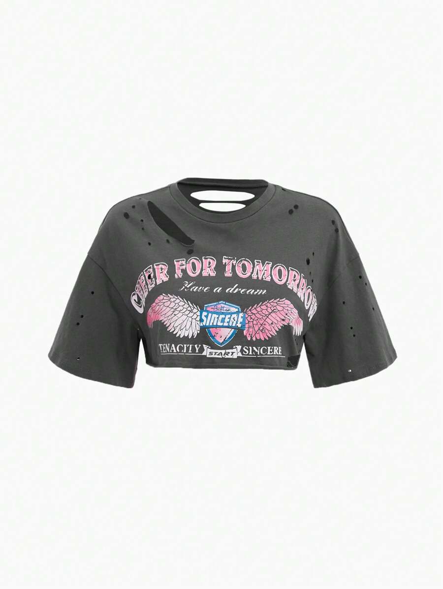 Slogan Graphic Ripped Drop Shoulder Crop Top CHEER FOR TOMORROW Have A Dream BETTER SINCERE TENACITY START SINCERE
