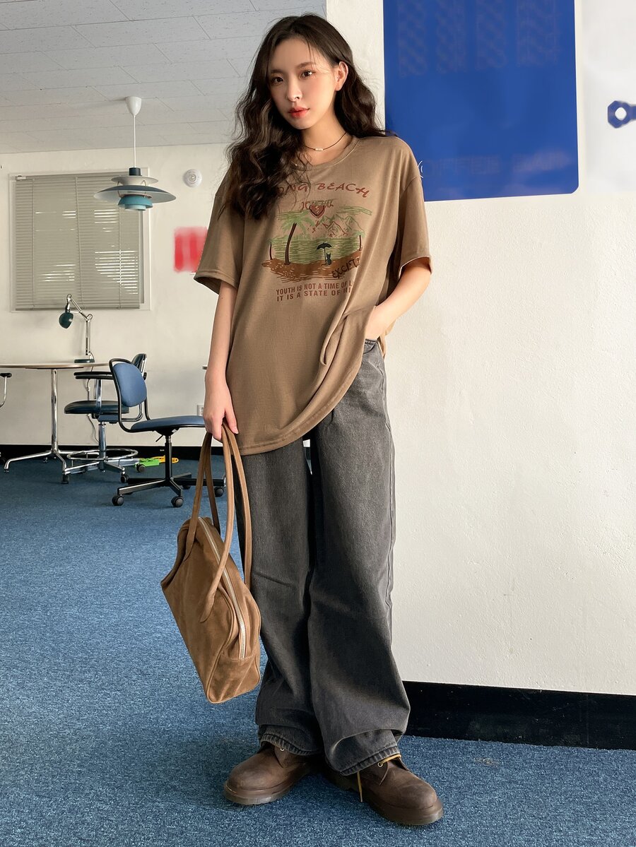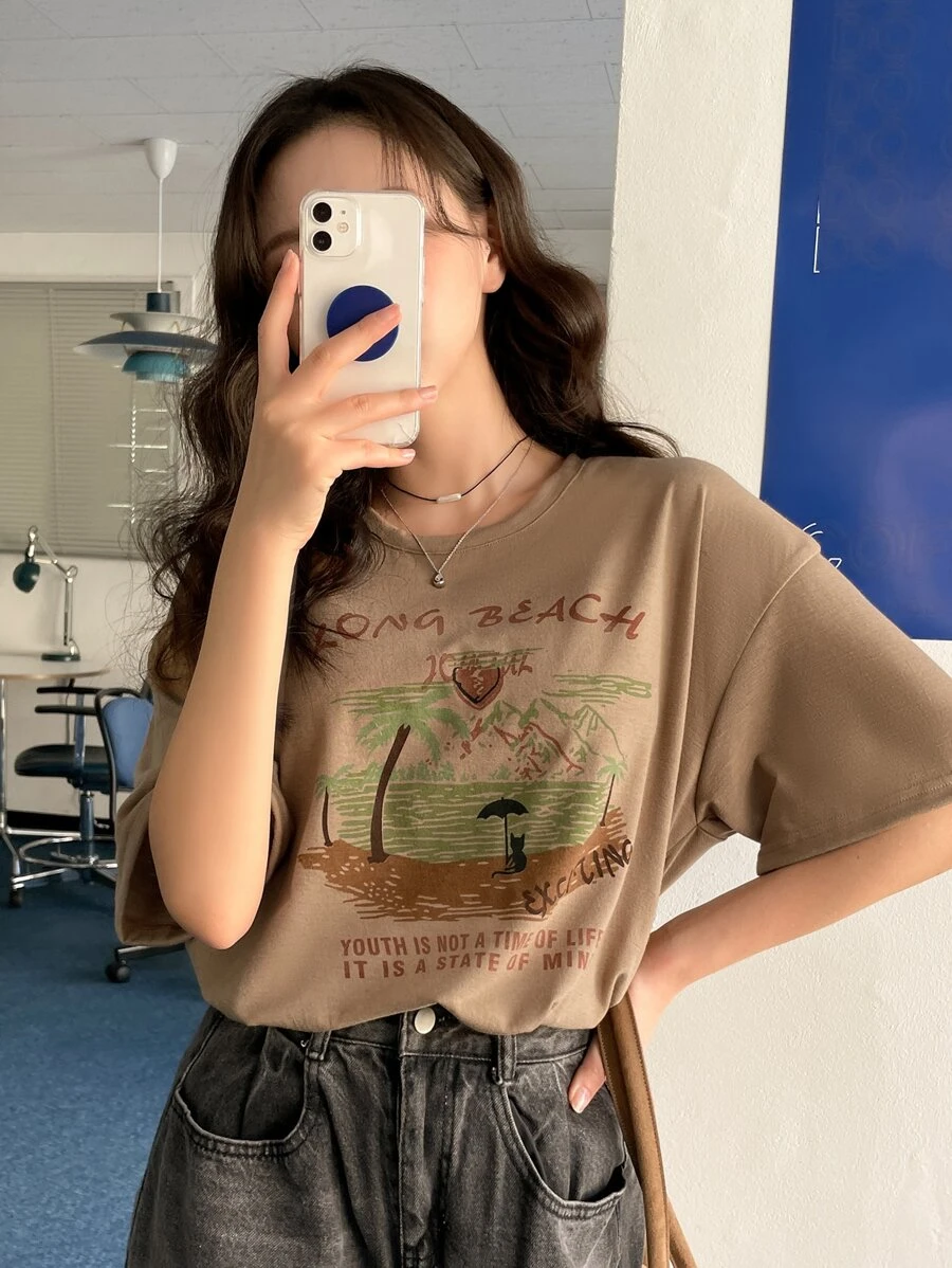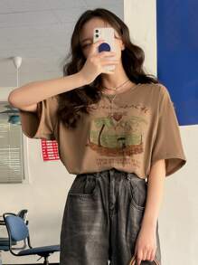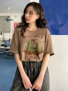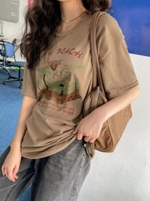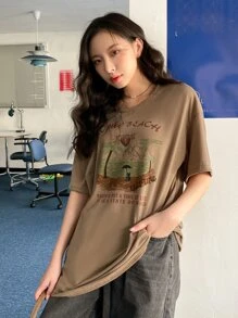 Slogan & Palm Tree Print Drop Shoulder Tee
