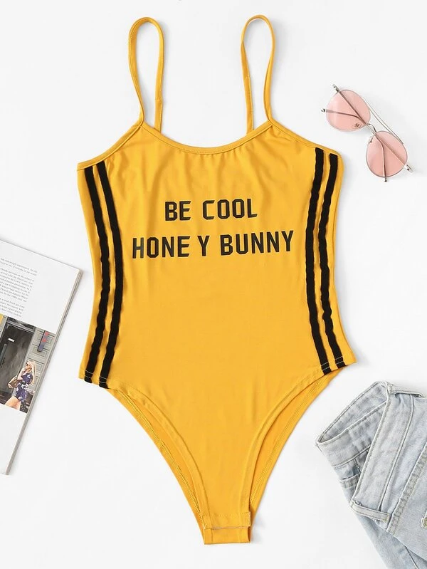 Slogan Print Striped Side Bodysuit