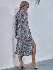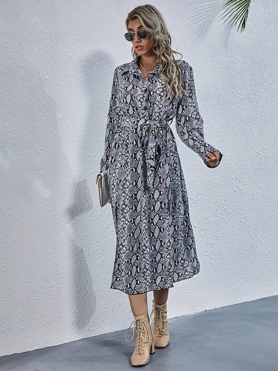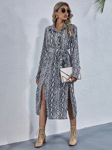 Snakeskin Print M-slit Thigh Belted Shirt Dress