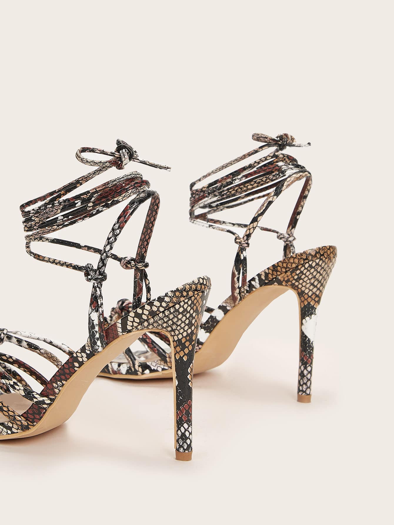 Snakeskin Print Open Toe Tig Leg Stiletto Sandals