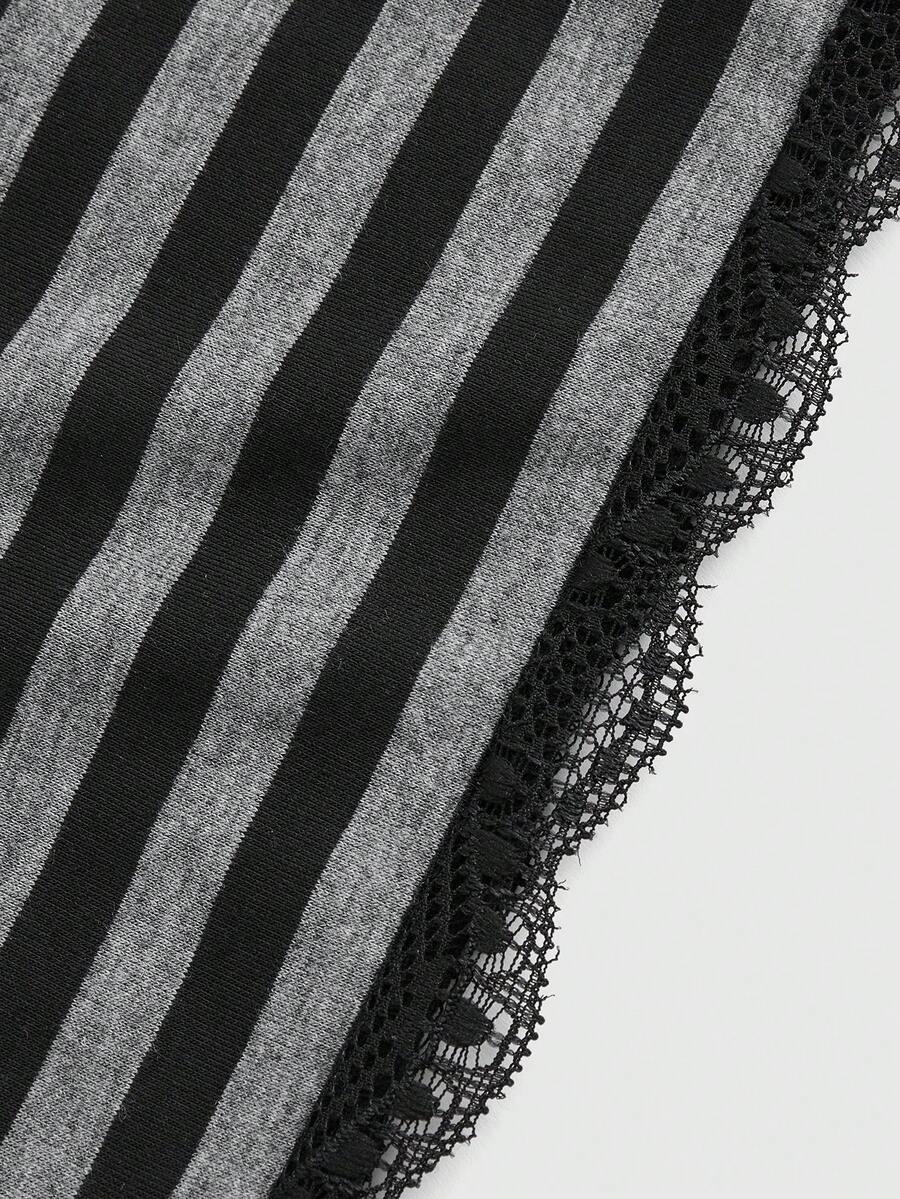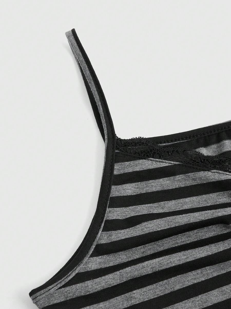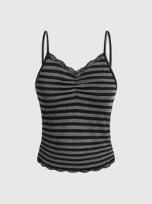 Soft Black Gray Stripe Tight Fit Camisole With Pleated Chest And Lace Hemline, Versatile Style