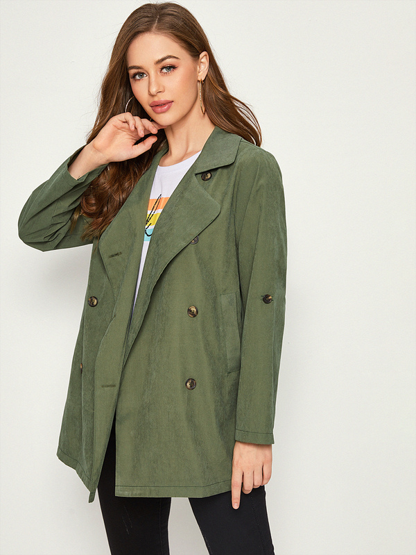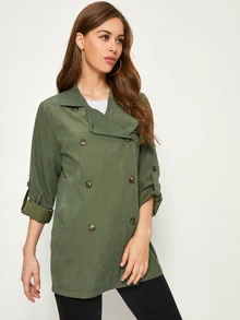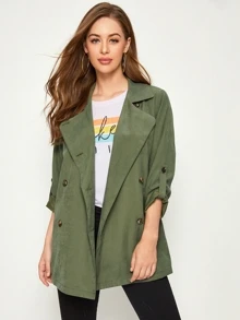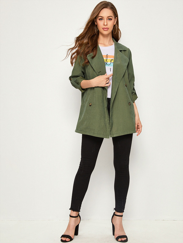 Solid Double-breasted Roll Up Sleeve Trench Coat