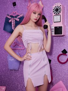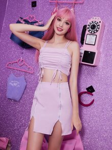 Solid Drawstring Shirred Cami & Zip Up Skirt
