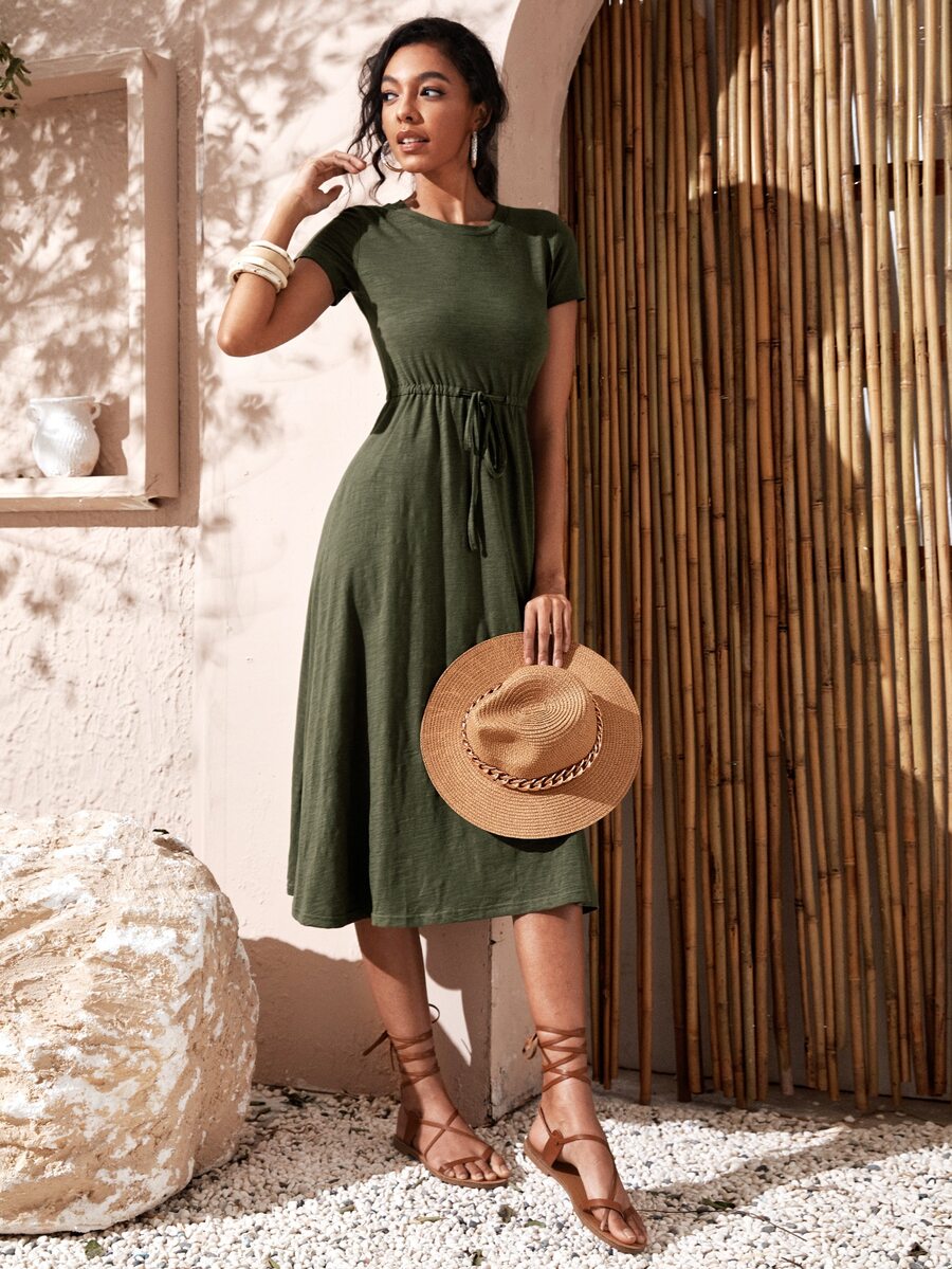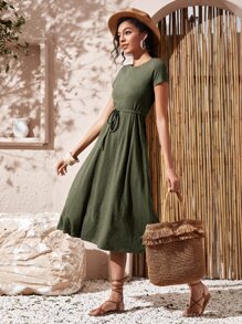 Solid Drawstring Waist Midi Dress