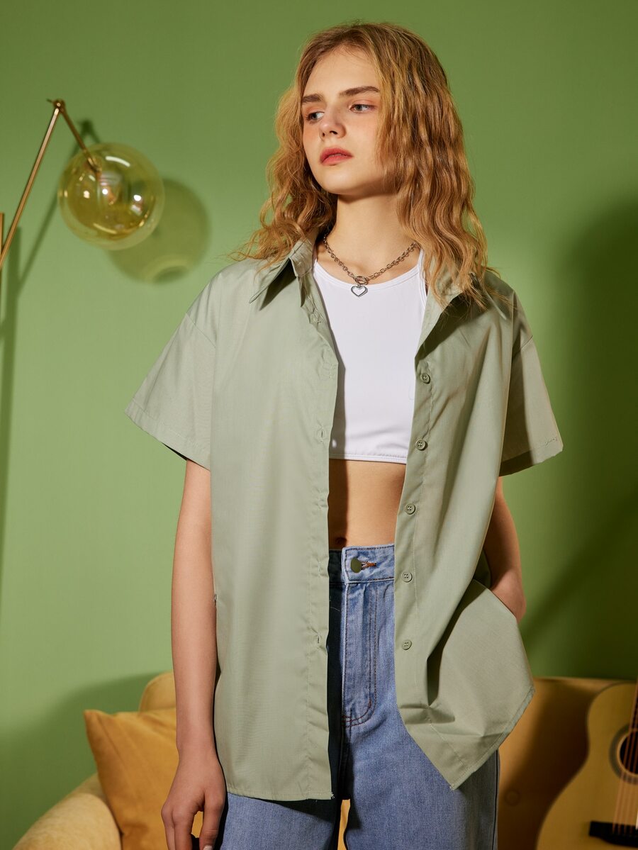 Solid Drop Shoulder Button Up Shirt