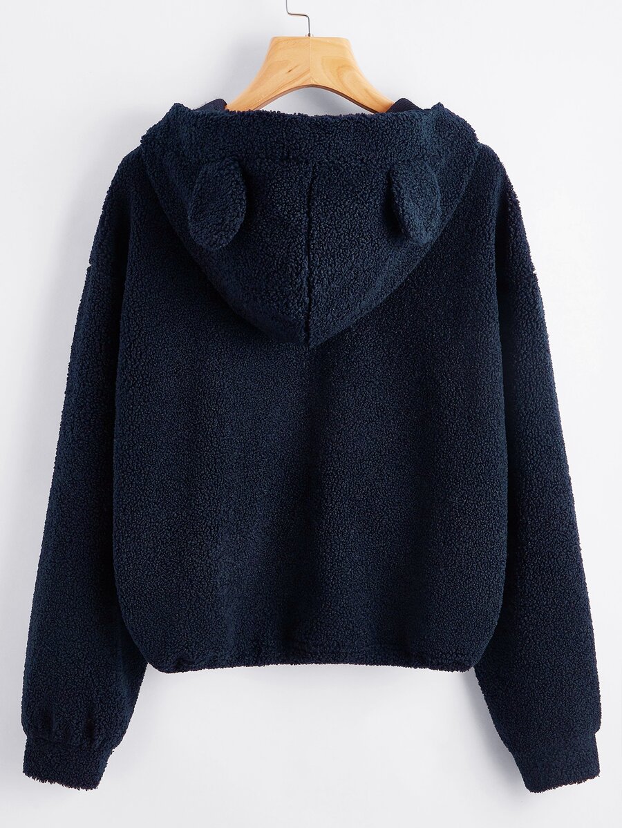 Solid Half Zip 3D Ears Design Teddy Hoodie