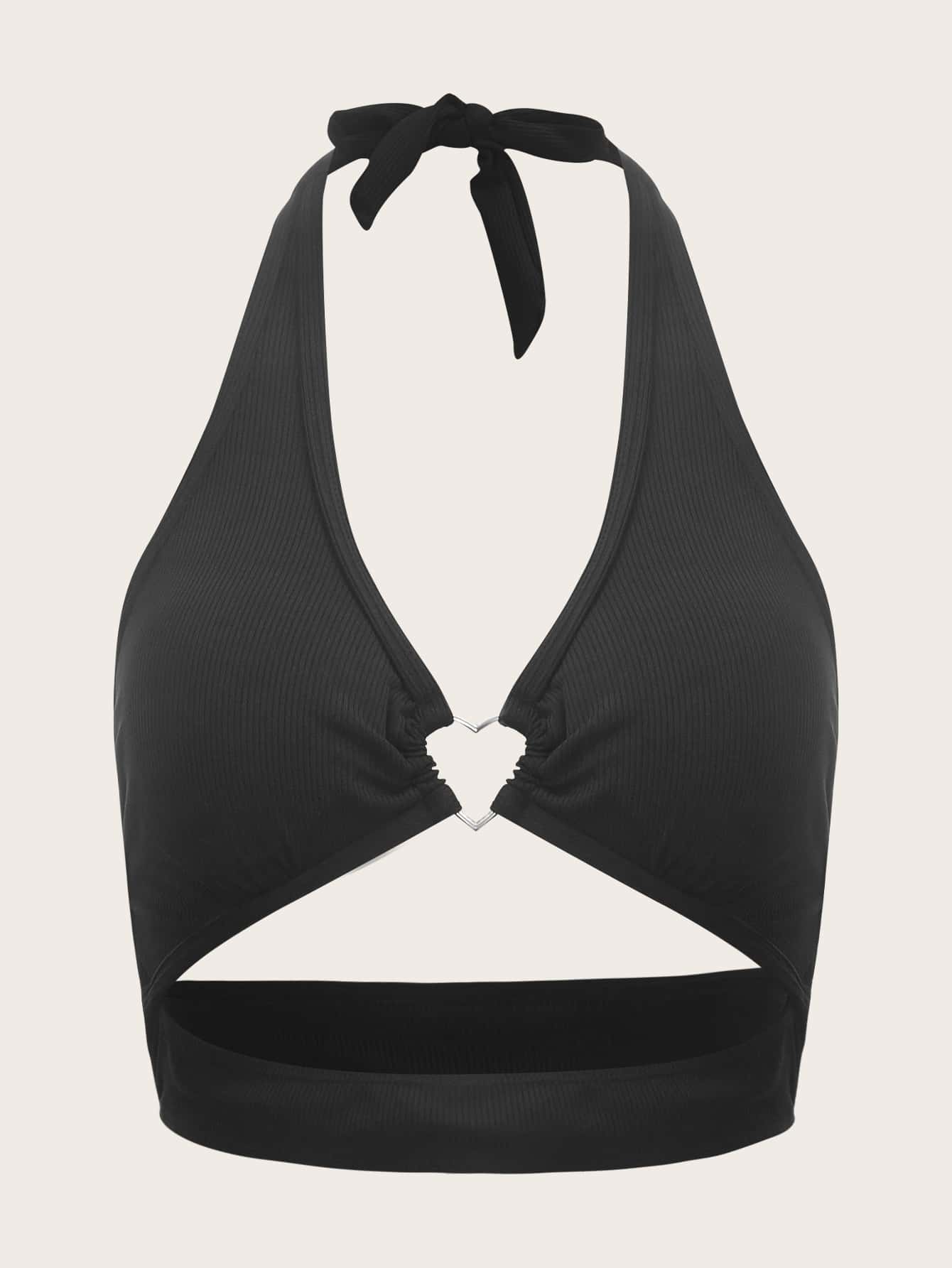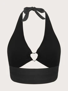 Solid Heart-ring Linked Cut Out Halter Tankini Top