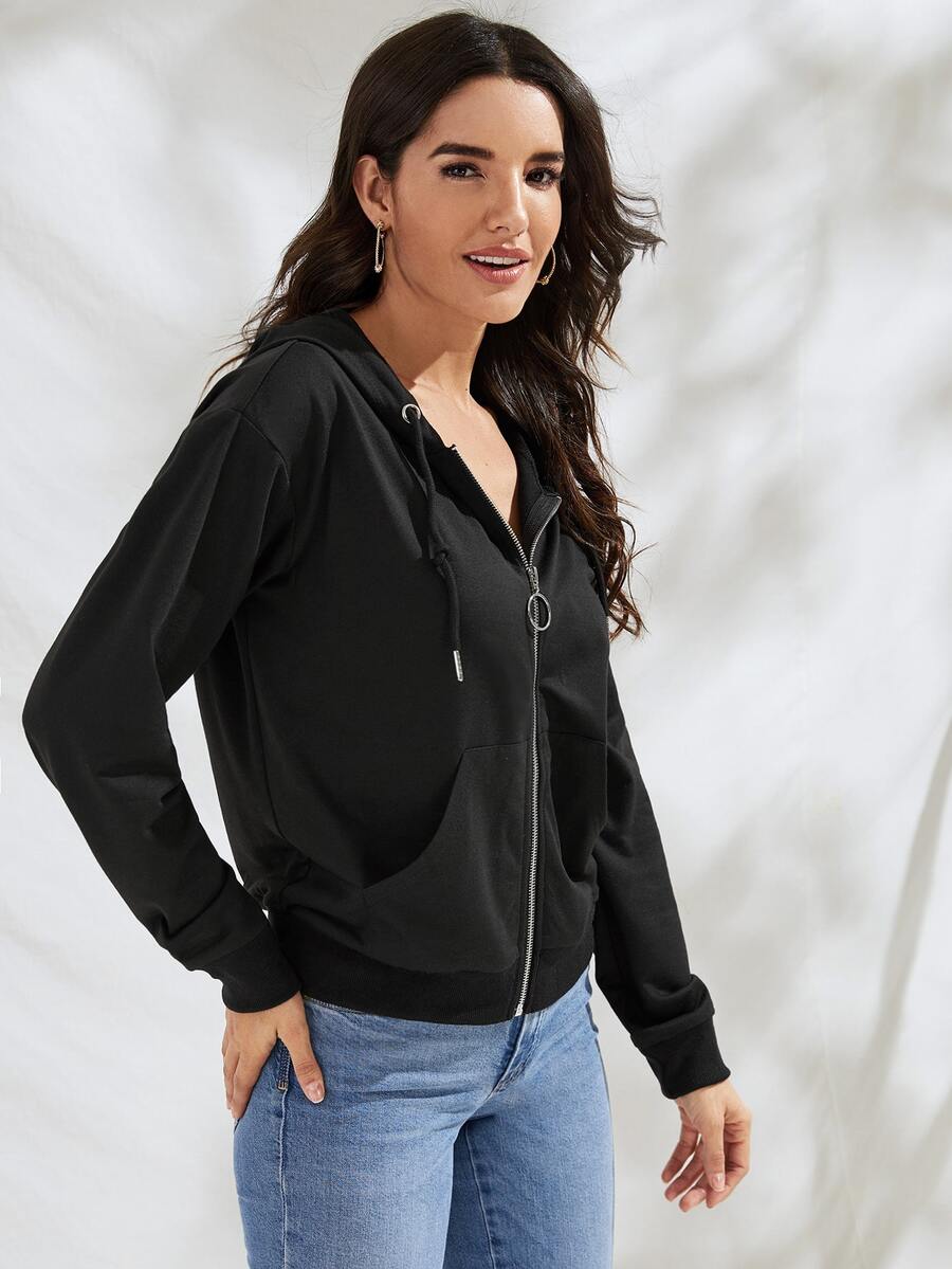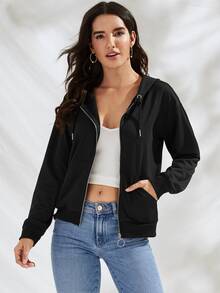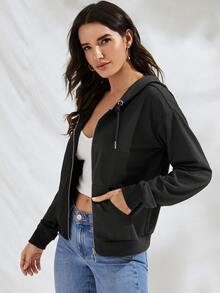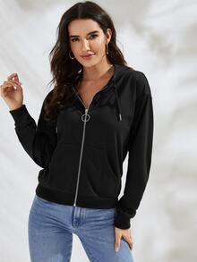 Solid Pocket Front Drawstring Zip-up Hoodie