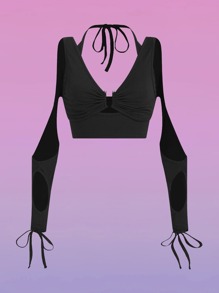 Solid Ring Linked Drawstring Ruched Crop Top