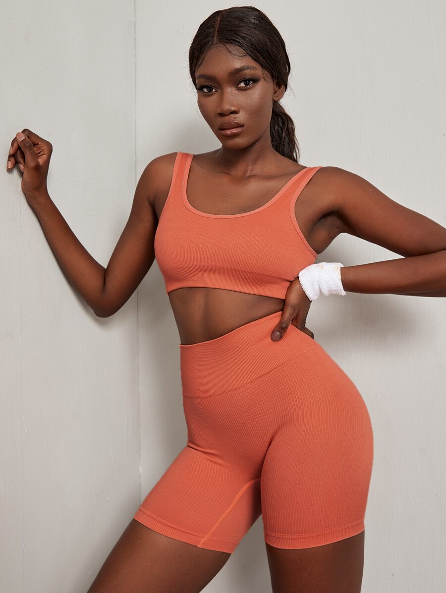 Solid Seamless High Stretch Sports Bra With Biker Shorts