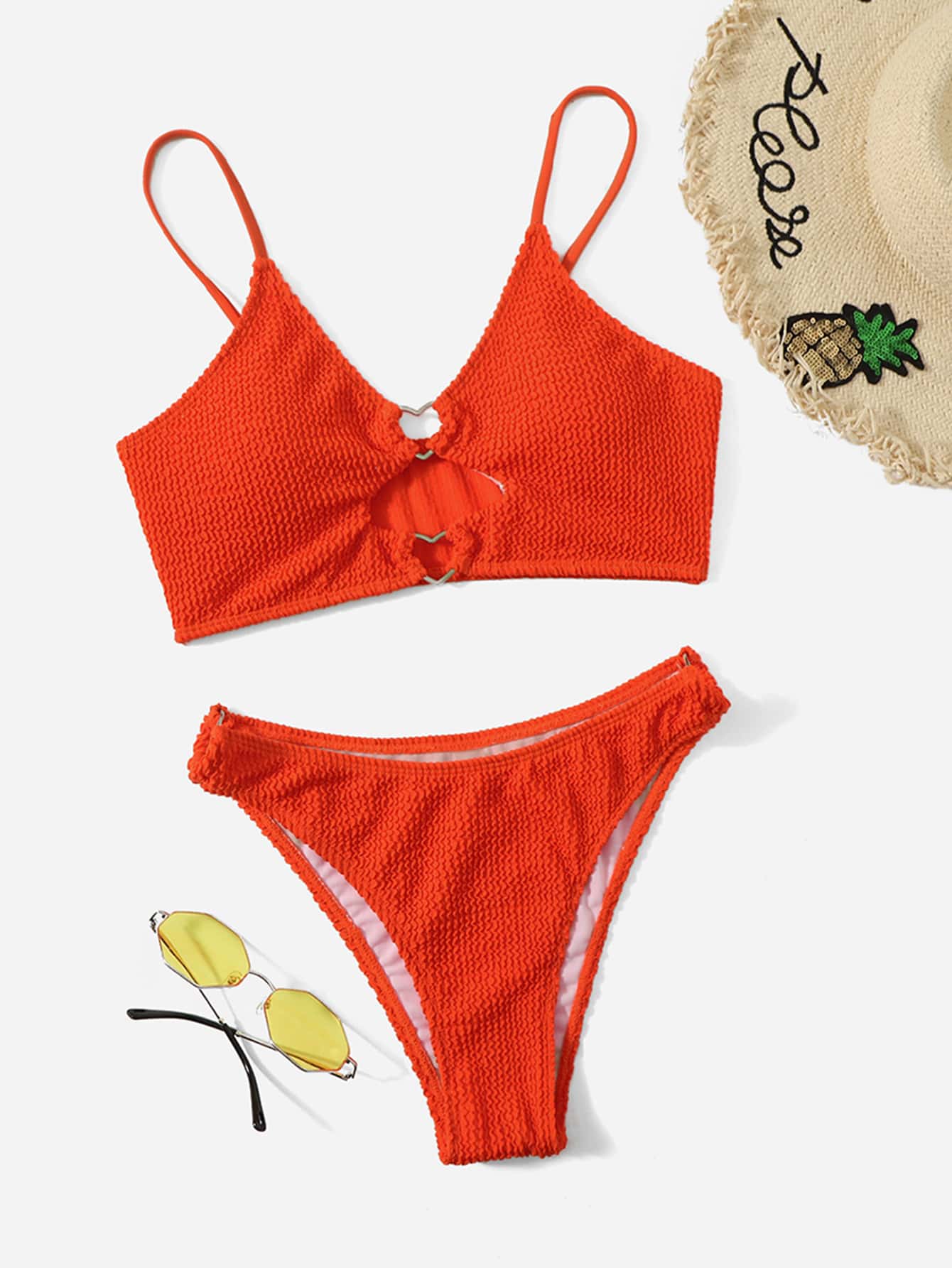 Solid Textured Heart-Ring Linked Cut Out Bikini