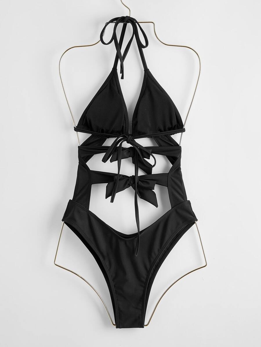 Solid Tie Back One Piece Swimsuit Summer Beach
